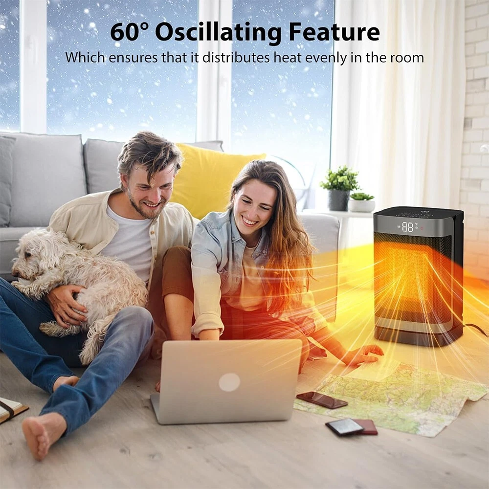 Space Heater Indoor with Thermostat, 16 inch PTC Electric Heater, 60°Oscillating, 4 Modes, 12h Timer, 1500W Portable Heater for Indoor Use, Black About this item Powerful and Faster Heat: Space heater with 1500W Fast PTC Ceramic Heating, it heats up the room in no time, can quickly heat an area of 270 square feet. Multiple Safety Protection Mechanism: Indoor heater with ETL-Certified Safety, it made with V-0 flame retardant materials and provides tip-over and overheat protection, safety plug, to ensures that the heater is safe to use at all times, is the perfect choice for families with children and pets. Energy Saving ECO Mode: Space heaters for indoor use, with multiple modes (High/Low/ECO/Fan Only), When you select ECO mode, you can press "+" or "-" to adjust the temperature to generate more or less heat. The temperature setting range is from 41 to 95℉, adjustable in 1℉ increments. Can Be Used Anywhere: Electric heater comes with 60 °Oscillating feature,which ensures that it distributes heat evenly in the room, suitable for use in bedrooms, garages, basements, offices, etc. The hidden rear carrying handle ensures easy transport and storage whenever needed. Noiseless Experience:Portable heater features a silent fan design, he working noise is 38db,it does not affect your work or sleep. the heater has a Timer, which you can set for up to 12 hours, which ensures that the heater switches off automatically, saving energy and preventing overheating. On Feb 8, 2025 at 03:23:31 PST, seller added the following information: