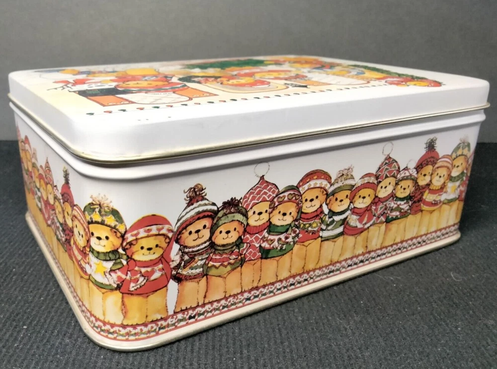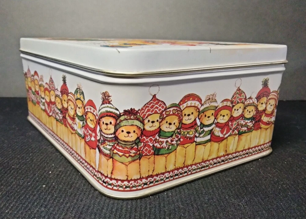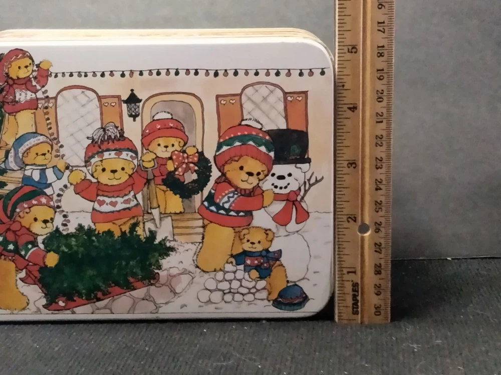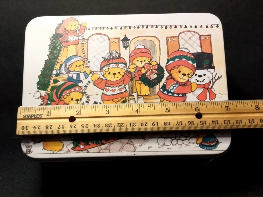 Shape: Rectangle Country/Region of Manufacture: Hong Kong Packaging: Box gtin13: Does not apply Material: Metal Closure Type: Lid Department: Kids, Teens, Adults Size: Medium Type: Box Handmade: No Subject: Bear Finish: Painted Customized: No Style: 1980s Pattern: Bears Time Period Manufactured: 1980-1989 Occasion: Christmas Number in Pack: 1 Brand: Enesco Original/Reproduction: Licensed Reproduction Engraved: No Features: Boxed Theme: Christmas Color: Multicolor UPC: Does not apply