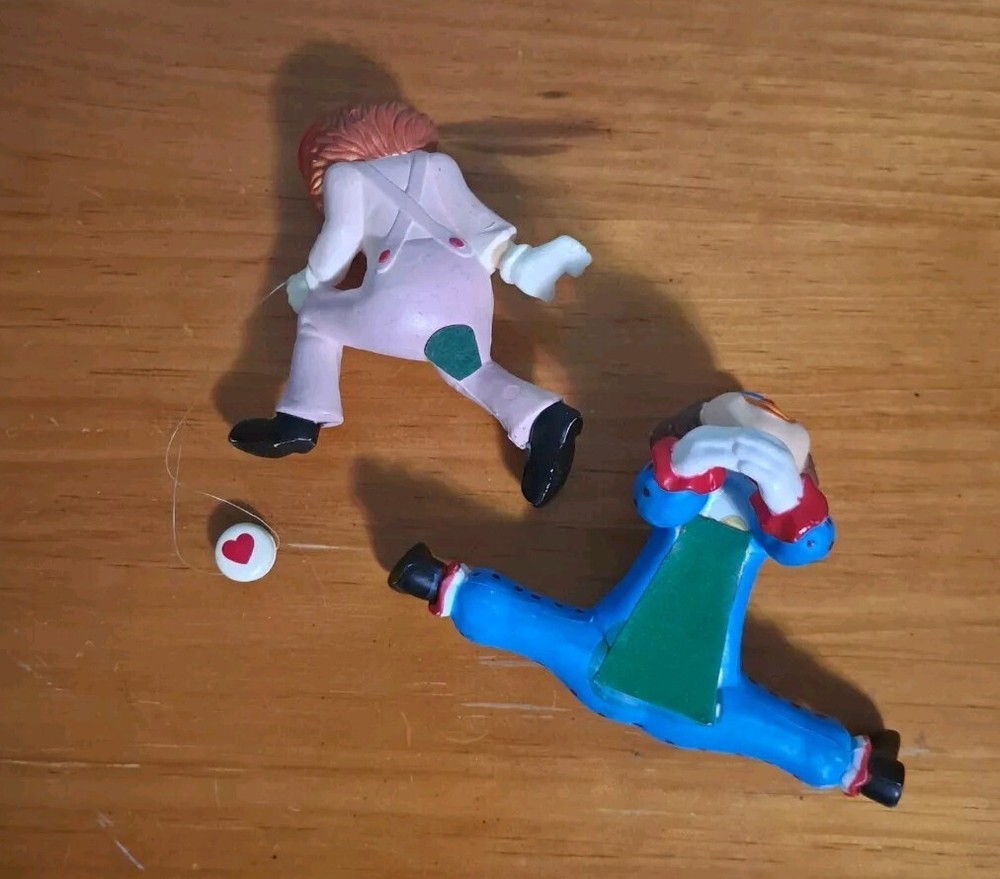 2 Shelf Sitter Enesco Clowns Valentine Figurines 5 inch pink with yoyo, 5 inch wide blue doing splits.