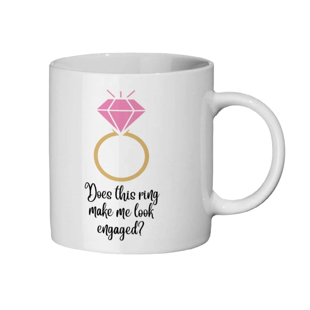 Engagement Gift Engagement Mug Engagement Ring Does This Ring Make Me Look Engaged Wedding Gift Gift For Wedding Bride To Be Product Details.. This high quality 11oz. ceramic white mug has a premium hard coat that provides crisp and vibrant color reproduction sure to last for years. Perfect for all hot & cold beverages. The highest quality printing possible is used. It will never fade no matter how many times you wash it. Material: 100% Ceramic. Print both sides. Dishwasher and Microwave Safe. High Gloss + Premium White Finish. Printed in the U.S.A. Personalized & Custom. We support personalized and custom mug to add custom, when placing an order, you can add notes to the "order note" in shipping address section. Also you can contact us directly via message. Shipping Info. Ready to ship in 1 to 2 business days, All products are made-to-order and proudly printed in the United States. Shipped by USPS and DHL, You will receive your order in 5-7 days. Replace & Refund. All products are defective during shipping broken, chipped will be replaced free of charge. You are not satisfied with the product, we will refund 100% money to you. If any other issues arise, please do not hesitate to message, we would be more than happy to assist you.
