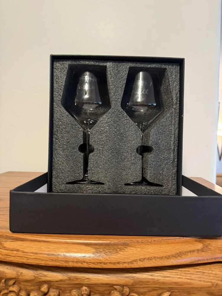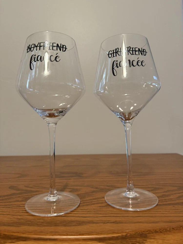 Celebrate your special moment with this hand-made wine glass set, perfect for engagement parties or a romantic dinner. The clear glasses are adorned with intricate designs, making them a unique addition to your drinkware collection. These glasses are made of high-quality glass material, ensuring durability and longevity. This set includes two glasses, perfect for sharing a bottle of wine or two. The glasses are designed for easy drinking and are suitable for any occasion. They are an excellent choice for those who appreciate the beauty and elegance of hand-made glassware. Add a touch of sophistication to your special occasion with these exquisite wine glasses.