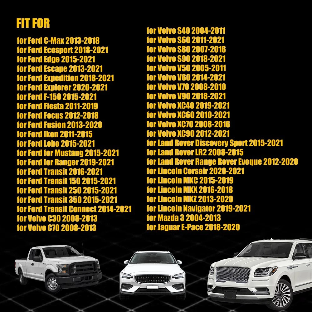 Feature: *High quality material Made of superior plastic material without rust,corrosion,stripping to ensure its high durability . *Direct replacement Direct replacement from stock application. Drillings and cuttings are not requried. *Perfect fit Manufactured according to originals for a perfect match with your car. *All tested before shipment All products were tested for performance and to ensure the accurate parameter for your vehicle.' *Warm notice Please double-check the part number and models in the description to guarantee it fits your vehicle before ordering. Specification: Engine Coolant Radiator Reservoir Tank Cap for Ford Transit 150 250 2015-2021 Feature: *High quality material Made of superior plastic material without rust,corrosion,stripping to ensure its high durability . *Direct replacement Direct replacement from stock application. Drillings and cuttings are not requried. *Perfect fit Manufactured according to originals for a perfect match with your car. *All tested before shipment All products were tested for performance and to ensure the accurate parameter for your vehicle.' *Warm notice Please double-check the part number and models in the description to guarantee it fits your vehicle before ordering. Specification: OE:DG93-8101-AA, 31549, 1224233, 1301104, 30680002, 306800020, 31368311, 3M5H8100AC, 3M5H8100AD, BE8Z8100A, DG938101AA, DG9Z8100A, J9C1407, LF5015205A, LR000243 Material:Plastic Fits for: for Ford C-Max 2013-2018 for Ford Ecosport 2018-2021 for Ford Edge 2015-2021 for Ford Escape 2013-2021 for Ford Expedition 2018-2021 for Ford Explorer 2020-2021 for Ford F-150 2015-2021 for Ford Fiesta 2011-2019 for Ford Focus 2012-2018 for Ford Fusion 2013-2020 for Ford Ikon 2011-2015 for Ford Lobo 2015-2021 for Ford for Mustang 2015-2021 for Ford for Ranger 2019-2021 for Ford Transit 2016-2021 for Ford Transit 150 2015-2021 for Ford Transit 250 2015-2021 for Ford Transit 350 2015-2021 for Ford Transit Connect 2014-2021 for Volvo C30 2008-2013 for Volvo C70 2008-2013 for Volvo S40 2004-2011 for Volvo S60 2011-2021 for Volvo S80 2007-2016 for Volvo S90 2018-2021 for Volvo V50 2005-2011 for Volvo V60 2014-2021 for Volvo V70 2008-2010 for Volvo V90 2018-2021 for Volvo XC40 2019-2021 for Volvo XC60 2010-2021 for Volvo XC70 2008-2016 for Volvo XC90 2012-2021 for Land Rover Discovery Sport 2015-2021 for Land Rover LR2 2008-2015 for Land Rover Range Rover Evoque 2012-2020 for Lincoln Corsair 2020-2021 for Lincoln MKC 2015-2019 for Lincoln MKX 2016-2018 for Lincoln MKZ 2013-2020 for Lincoln Navigator 2019-2021 for Mazda 3 2004-2013 for Jaguar E-Pace 2018-2020 Package include: 1Pc Engine Coolant Reservoir Cap What makes you choose our products? 1. Rapid logistics and response We will dispatch your order within 24 hours since your payment to guarantee that you can receive your order immediately. 2. High quality The raw materials are strictly inspected high-quality ones. In addition, our inspectors will inspect all the products again before they are dispatched to guarantee all customers receive good products. 3. Guaranteed after sales service We provide quality guarantee services ranging from 6 months to 10 years. Any customer can contact us for any problem during the period. We provide after sales services around the clock (7 x 24h). 4. High cost performance Providing products with high cost performance is our lasting objective. Our products may not be the cheapest or expensive ones, but they must be the ones with the optimal cost performance. In general,you can enjoy reliable quality, speedy service along with competitive price. Your satisfaction is my goal.My customer service is not only the guarantee of money,but also the guarantee for your time and expectation. Item Specifics Brand AUXITO Performance Part Yes Brand AUXITO Manufacturer Part Number DG93-8101-AA, 31549, 1224233, 1301104, 30680002, 306800020 Material Plastic Product Name Engine Coolant Reservoir Cap Net Weight 51g Shell Color Black Dimension 6.2x3.8cm / 2.44"x1.50"(D*H) Packing List Engine Coolant Reservoir Cap*1 Payment We can accept payment by credit, debit, and gift cards; Apple Pay, Google Pay, PayPal, and PayPal Credit. Shipping 1. All items will be shipped in 24 hours after receiving your payment . 2. We ship this item to US only via USPS first class mail. It usually takes 3-5 working days to deliver. Returns 1. We offer 60 days return policy. 2. Please contact us within 60 days from the date you receive your package if you have any questions with the products . 3. Refund will be sent after we got your returned package. 4. All returned items should be in the original packaging with tracking number. Contact Us We work from Monday - Saturday 9:00AM - 6:00PM PST, but we will reply you once we get your message .There will be some delay on response if you send message or E-Mail on Sunday. DESCRIPTION PAYMENT SHIPPING RETURN POLICY CONTACT US Hot item AUXITO 3157 3156 LED Flashing Brake Stop Stobe Tail Light Bulb Blinker Bulb 2F23 USD 12.91 AUXITO 3157 4157 Amber LED Turn Signal Side Marker Indicator Corner Light 2F23 USD 12.91 Help & Info Payment Policy Shipping Policy Return Policy FAQ About Us Engine Coolant Radiator Reservoir Tank Cap for Ford Transit 150 250 2015-2021 Feature: *High quality material Made of superior plastic material without rust,corrosion,stripping to ensure its high durability . *Direct replacement Direct replacement from stock application. Drillings and cuttings are not requried. *Perfect fit Manufactured according to originals for a perfect match with your car. *All tested before shipment All products were tested for performance and to ensure the accurate parameter for your vehicle.' *Warm notice Please double-check the part number and models in the description to guarantee it fits your vehicle before ordering. Specification: OE:DG93-8101-AA, 31549, 1224233, 1301104, 30680002, 306800020, 31368311, 3M5H8100AC, 3M5H8100AD, BE8Z8100A, DG938101AA, DG9Z8100A, J9C1407, LF5015205A, LR000243 Mater