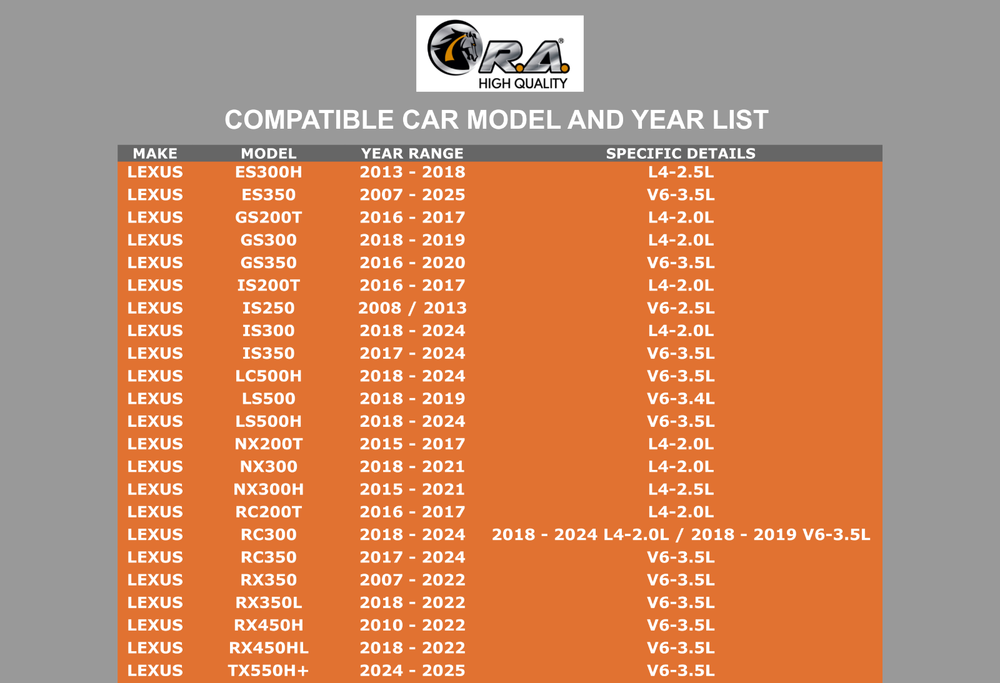 Engine Oil Filter (12 Pack) For LEXUS RC200T RC300 RC350 RX350L RX450HL TX550H+ RA. Engine Oil Filter, Air Filters and Cabin Filters have several benefits, including: Proven protection for up to 10,000 miles (16,000 kilometers) Engineered for use with synthetic or conventional motor oils Easy to install for a hassle-free upgrade Filter media is a blend of fiber and resin that captures 95% of the dirt particles Filters are a key component of a car's engine system, and choosing the right type of filter for your vehicle is important for a safe and smooth driving experience. From oil filters to air and cabin filters, each plays a crucial role in maintaining optimal engine performance, efficiency, and air quality. Engine Oil Filter Kit Includes: 1x Engine Oil Filter - RA-9972-12P-1 Fits MAKE MODEL YEAR RANGE SPECIFIC DETAILS LEXUS RC200T 2016 - 2017 L4-2.0L Models LEXUS RC300 2018 - 2024 2018-2024 L4-2.0L / 2018-2019 V6-3.5L LEXUS RC350 2017 - 2024 V6-3.5L Models LEXUS RX350 2007 - 2022 V6-3.5L Models LEXUS RX350L 2018 - 2022 V6-3.5L Models LEXUS RX450H 2010 - 2022 V6-3.5L Models LEXUS RX450HL 2018 - 2022 V6-3.5L Models LEXUS TX550H+ 2024 - 2025 V6-3.5L Models Contact us We can be contacted at any time through eBay messages if you have any questions, comments or product requests. We will respond to you within 24 hours and do our best to help you out! We encourage our customers to contact us with any questions or concerns! We'd like to be sure you are completely satisfied with your purchase. Open hours (EST) Monday: 9a.m. - 4p.m. Tuesday: 9a.m. - 4p.m. Wednesday: 9a.m. - 4p.m. Thursday: 9a.m. - 4p.m. Friday: 9a.m. - 4p.m. Saturday: Closed Sunday: Closed Payment We use eBay's Safe and Secure Checkout. We accept PayPal, Visa, MasterCard, Amex (Immediate Payment Required). Sales tax may be applied to your order depending on your location and local regulations. This will be automatically calculated and added during checkout. Shipping All orders placed before 3pm (Eastern Standard) will be shipped the same business day. Orders made after 3pm (Eastern Standard) will be shipped the following business day. All orders in the continental 48 States will be shipped FREE of charge via USPS, FEDEX or USPS at our discretion. Orders outside the continental 48 States (Alaska, Hawaii, Puerto Rico, US territories, or International) will be required to pay a surcharge for shipping. International orders will be shipped via USPS Priority Mail International through eBay Global Shipping Program. Returns Customer must contact RA Auto Parts within 30 days of receiving shipment for approval of any return or exchange. Returns or exchanges will be subject to a 20% restocking fee of the original item purchased plus cost of return shipping and replacement shipping. Exchanges due to shipping errors by RA Auto Parts will not be subject to a restocking fee or shipping charges.