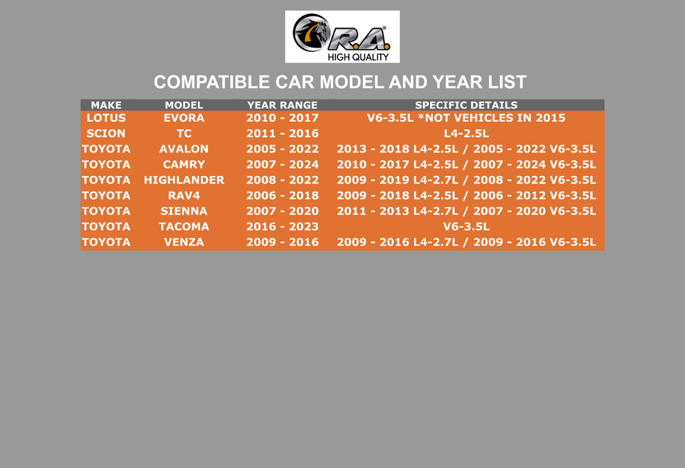 Engine Oil Filter (12 Pack) For TOYOTA AVALON CAMRY HIGHLANDER RAV4 SIENNA TACOMA VENZA RA. Engine Oil Filter, Air Filters and Cabin Filters have several benefits, including: Proven protection for up to 10,000 miles (16,000 kilometers) Engineered for use with synthetic or conventional motor oils Easy to install for a hassle-free upgrade Filter media is a blend of fiber and resin that captures 95% of the dirt particles Filters are a key component of a car's engine system, and choosing the right type of filter for your vehicle is important for a safe and smooth driving experience. From oil filters to air and cabin filters, each plays a crucial role in maintaining optimal engine performance, efficiency, and air quality. Engine Oil Filter Kit Includes: 1x Engine Oil Filter - RA-9972-12P-4 Fits MAKE MODEL YEAR RANGE SPECIFIC DETAILS TOYOTA AVALON 2005 - 2022 2013-2018 L4-2.5L / 2005-2022 V6-3.5L TOYOTA CAMRY 2007 - 2024 2010-2017 L4-2.5L / 2007-2024 V6-3.5L TOYOTA HIGHLANDER 2008 - 2022 2009-2019 L4-2.7L / 2008-2022 V6-3.5L TOYOTA RAV4 2006 - 2018 2009-2018 L4-2.5L / 2006-2012 V6-3.5L TOYOTA SIENNA 2007 - 2020 2011-2013 L4-2.7L / 2007-2020 V6-3.5L TOYOTA TACOMA 2016 - 2023 V6-3.5L Models TOYOTA VENZA 2009 - 2016 2009-2016 L4-2.7L / 2009-2016 V6-3.5L Contact us We can be contacted at any time through eBay messages if you have any questions, comments or product requests. We will respond to you within 24 hours and do our best to help you out! We encourage our customers to contact us with any questions or concerns! We'd like to be sure you are completely satisfied with your purchase. Open hours (EST) Monday: 9a.m. - 4p.m. Tuesday: 9a.m. - 4p.m. Wednesday: 9a.m. - 4p.m. Thursday: 9a.m. - 4p.m. Friday: 9a.m. - 4p.m. Saturday: Closed Sunday: Closed Payment We use eBay's Safe and Secure Checkout. We accept PayPal, Visa, MasterCard, Amex (Immediate Payment Required). Sales tax may be applied to your order depending on your location and local regulations. This will be automatically calculated and added during checkout. Shipping All orders placed before 3pm (Eastern Standard) will be shipped the same business day. Orders made after 3pm (Eastern Standard) will be shipped the following business day. All orders in the continental 48 States will be shipped FREE of charge via USPS, FEDEX or USPS at our discretion. Orders outside the continental 48 States (Alaska, Hawaii, Puerto Rico, US territories, or International) will be required to pay a surcharge for shipping. International orders will be shipped via USPS Priority Mail International through eBay Global Shipping Program. Returns Customer must contact RA Auto Parts within 30 days of receiving shipment for approval of any return or exchange. Returns or exchanges will be subject to a 20% restocking fee of the original item purchased plus cost of return shipping and replacement shipping. Exchanges due to shipping errors by RA Auto Parts will not be subject to a restocking fee or shipping charges.