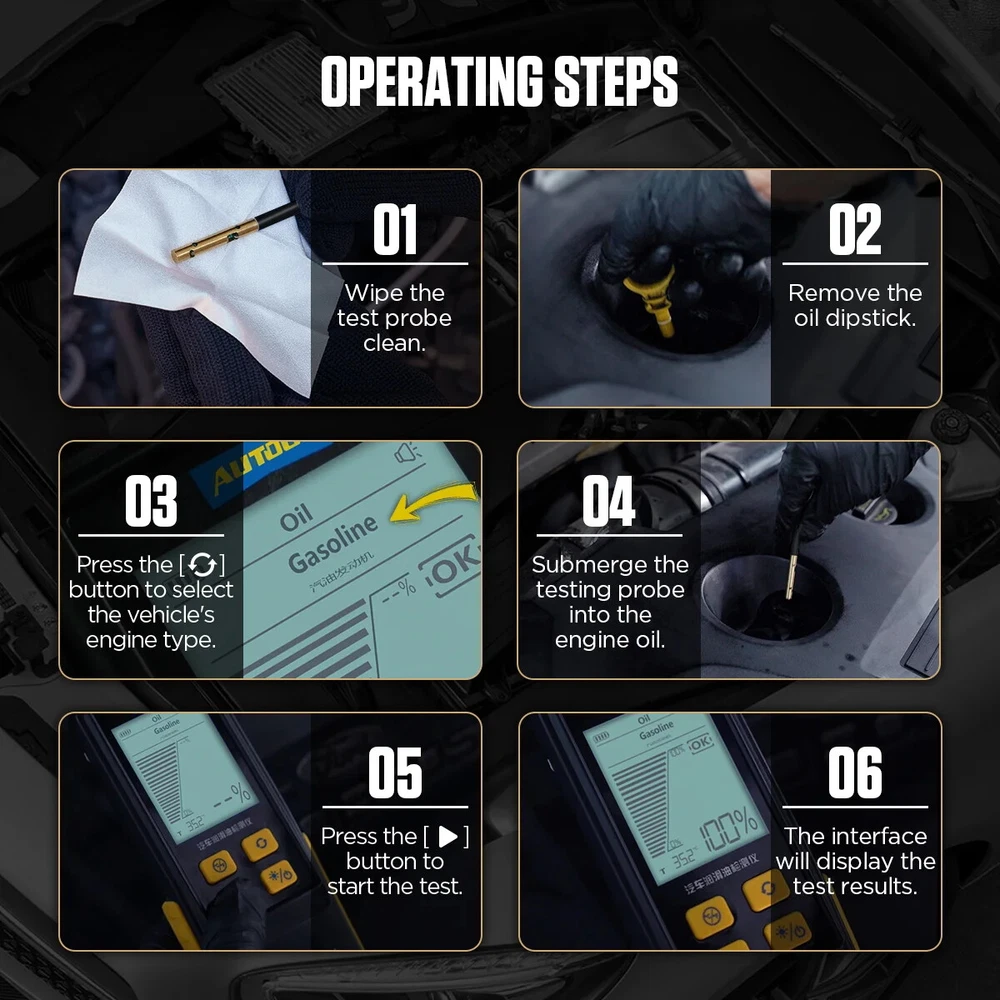 AS503 Engine Oil Tester with Digital Display for Auto Check Gasoline & Diesel Car Engine POA Oil Quality Repair Tools AS503 Engine Oil Tester is a specialized oil testing device tailored for the automotive inspection and maintenance sector. Its primary function involves measuring the transparency of engine oil within gasoline or diesel engines. This measurement reflects the presence of impurities and contaminants within the oil. Consequently, it assesses the quality and performance of engine oil, effectively preventing potential engine issues and malfunctions, thereby ensuring the engine operates normally and efficiently. Note : The main functions of AS503 and AS505 include measuring the transparency of engine oil in gasoline or diesel engines. The measured value reflects the existence of impurities and pollutants in the oil. It can detect impurities produced by mechanical friction of metals. You can directly use the old engine oil for the test. thank you AUTOOL AS503 Engine Oil Tester Features: 【Optical Principle Precision Test】Auto Oil Quality Check,The 2.8 Inchs LED display can accurately display the results and the readings are clearer.Use the optical principle to check the engine oil condition,with a clear display for efficient operation even in varying lighting conditions,be it bright daylight or dim nighttime.Use the optical principle to check the engine oil condition and get the latest oil condition in anytime and anywhere.get the latest oil condition in anytime and anywhere. 【Sound Alarm】when the transmittance is between 100% and 60%,there is no need to change engin oil.when the transmittance is between 60% and 30%,an exclamation mark will be displayed on the screen to remind you to change the engin oil. when it isbelow 30%.the engin oil tester will emit a “beep”alarm to remind you to change the engin oil immediately to ensure safety.[ T] to indicate the current oil measurement temperature. 【Premium Quality】The body's handheld portion is lined with silicone substrate,providing excellent grip & lightweight design for easy single-handed operation. The 800mm long probe designoffers a more flexible & convenient way ofconducting tests.The hose is made of PTFE material,highly resistant to oil&oxidation,and boasts exceptional corrosionresistance, effectively extending the product's lifespan. Operation steps: 1.wipe the test probe clean 2.remove the oil dipstick 3.press the ↶ button to select the vehicle's engine type 4.submerge the testing probe into the engine oil 5.press the ►buteon to start the test 6.the interface will display the test results Oil Temperature Measurement: Built-in temperature sensor measures and displays the actual oil temperature, reflecting the engine's operational status and load. Ensures measurement results are within the normal working temperature range. Compatible with Various Lubricant Oil Standards: Suitable for the majority of gasoline and diesel engine lubricant oils available in the market. Separate sampling and measurement for gasoline and diesel engines allow for more precise assessment of lubricant oil health. Flexible Hose Probe for Convenent Testing: The 800mm long probe design offers a more flexible&convenient way ofconducting tests. The hose is made of PTFE material, highly resistant to oil&oxidation, and boasts exceptional corrosion resistance, effectively extending the product's lifespan. High-pregision Optical Probe: Integrated with a high-precision optoelectronic sensor, ensuring more accurate measurement results. Large LCD with High Definition: Equipped with a backlit 2.8-inch LCD screen, providing users with a clear display for efficient operation even in varying lighting conditions, be it bright daylight or dim nighttime. User-friendly Handheld Design: The body's handheld portion is lined with silicone substrate,providing excellent grip & lightweight design for easy single-handed operation. Why Choose the AUTOOL Automotive Engine Oil Tester? The AUTOOL Automotive Engine Oil Tester is a professional tool designed for the automotive maintenance field. It is capable of measuring parameters like engine lubricant transparency and oil temperature. This device stems from AUTOOL's independent research and development, boasting several intellectual property rights. Moreover, it has received authoritative certifications from organizations like CE, FCC, and ROHS. Since engine oil play a key role in lubrication, cooling, rust prevention, cleaning, sealing, and buffering, using the AUTOOL Car Engine Oil Tester can effectively prevent engine issues and breakdowns. Through simple testing procedures, users can obtain accurate lubricant quality analysis and maintenance recommendations, ensuring the engine operates efficiently and extending its lifespan.