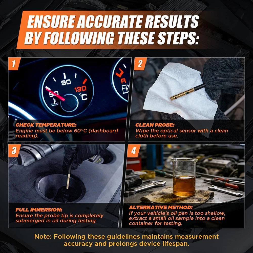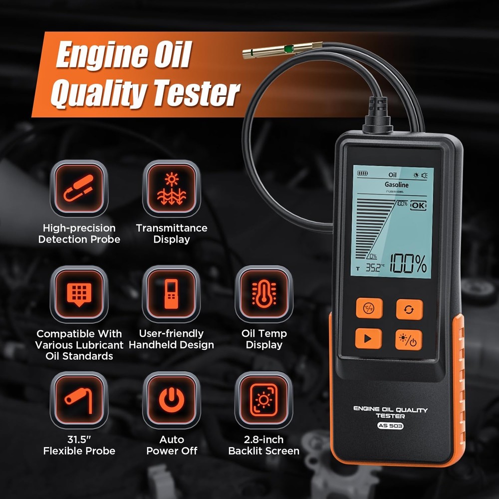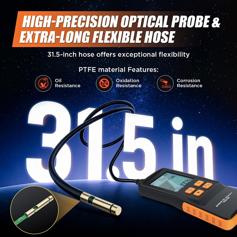 Free eBay listing template designed by dewiso.com Engine Oil Tester for Gasoline and Diesel Vehicles, Engine Oil Quality Tester, High Precision Analyzer with 2.8" Backlit Display, 31.5" PTFE Hose, Temperature & Transmittance Display FREE AND FAST SHIPPING! About this item Transmission Measurement and Oil Temperature Measurement: Insert the probe into the oil reservoir to measure light transmission, which provides a clear visual indicator of oil impurities or contamination. The built-in temperature sensor simultaneously measures and displays the current oil temperature, helping you assess engine performance. Temperature range: -10°C to 125°C (14°F to 257°F). Dual-Mode Compatibility: This engine oil quality tester supports simultaneous detection of both gasoline and diesel engine oil types, compatible with multiple lubricant standards. It works with most commercial gasoline and diesel engine lubricants, helping you monitor lubricant condition. Switch between Celsius/Fahrenheit display modes to show real-time oil temperature, ensuring operation within safe temperature ranges (-10°C to 60°C). 31.5" FLEXIBLE PTFE PROBE and DURABLE DESIGN: The 800mm oil-resistant Teflon hose reaches deep into various engine oil compartments. It provides outstanding oil resistance, oxidation resistance, and corrosion resistance. The high-precision photoelectric sensor ensures lab-grade accuracy, while the silicone grip provides comfortable, slip-resistant handling. 2.8" Backlit Lcd Screen & User-Friendly Operation: The large, clear display shows transmittance percentage, temperature, oil type, and status indicators, even in bright or low-light conditions. Automatically powers off after 5 minutes of inactivity to conserve power. Complete Kit: Includes 4 AAA batteries (ready to use), an English manual, If you have any questions or need assistance, please click “Contact Seller.”—our dedicated customer service team will provide you with a satisfactory solution. Product We offer a 30-Day Return Policy on items which you are not completely satisfied with. You have the option for a full-refund or an exchange of the item. No returns are available on items shipped outside of the US . Shipping We offer Free Shipping to the US and ship within 2 business days of payment, usually sooner. We use UPS express shipping. That's why your products are usually delivered within 3 days . Contact We try our very best to make sure every customer is completely satisfied. If there's a problem , message us! We're happy to help. 24/7 live chat available.