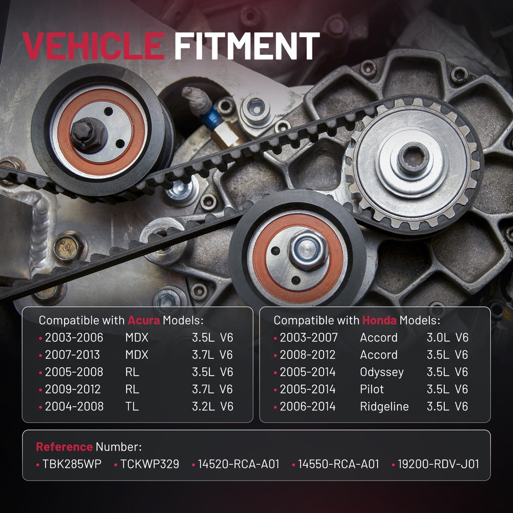 Specification: Condition: 100% brand new and superior quality Type:Timing Belt Kit Material: Aluminum, Steel, Cast Iron Greasable or Sealed: Sealed Warranty:2 Years Part Number: TBK285WP, TCKWP329, 14520-RCA-A01, 14550-RCA-A01,19200-RDV-J01 Fitment: Acura MDX 2003-2006 3.5L V6 Acura MDX 2007-2013 3.7L V6 Acura RL 2005-2008 3.5L V6 Acura RL 2009-2012 3.7L V6 Acura TL 2004-2008 3.2L V6 Honda Accord 2003-2007 3.0L V6 Honda Accord 2008-2012 3.5L V6 Honda Odyssey 2005-2014 3.5L V6 Honda Pilot 2005-2014 3.5L V6 Honda Ridgeline 2006-2014 3.5L V6 Package Included: 1*Water Pump+Water Pump Pad (Rubber) 1*Synchronous Belt 1*IdlerWheel 1*Drive Belt 1* Tensioner 1* Tensioning Wheel 3*Oil Seal Engine Timing Belt Kit with Water Pump For Acura TL 2004-2008 3.2L V6 Specification: Condition: 100% brand new and superior quality Type:Timing Belt Kit Material: Aluminum, Steel, Cast Iron Greasable or Sealed: Sealed Warranty:2 Years Part Number: TBK285WP, TCKWP329, 14520-RCA-A01, 14550-RCA-A01,19200-RDV-J01 Fitment: Acura MDX 2003-2006 3.5L V6 Acura MDX 2007-2013 3.7L V6 Acura RL 2005-2008 3.5L V6 Acura RL 2009-2012 3.7L V6 Acura TL 2004-2008 3.2L V6 Honda Accord 2003-2007 3.0L V6 Honda Accord 2008-2012 3.5L V6 Honda Odyssey 2005-2014 3.5L V6 Honda Pilot 2005-2014 3.5L V6 Honda Ridgeline 2006-2014 3.5L V6 Package Included: 1*Water Pump+Water Pump Pad (Rubber) 1*Synchronous Belt 1*IdlerWheel 1*Drive Belt 1* Tensioner 1* Tensioning Wheel 3*Oil Seal Payment Delivery details Terms of sales About us Contact us Payment 1.We only accept PayPal. PayPal is the only online payment method we accept. Please make sure you have a valid/confirmed PayPal account prior bidding. 2.All Paypal Payments must be Confirmed. Payment must be made within 48hrs of the auction end time. Non-Paying bidders will be reported. 3.When you get your package,maybe you will pay some charges, it's taxes for local customs,not pay to us, and the fees are depends on the customs, all buyer are same. Delivery details 1.Items will be shipped within 2 business days after payment is received. 2.We ship to your eBay address. Please make sure your eBay address is correct. Buyer takes responsibility if eBay address is wrong. 3.Import duties, taxes and charges are not included in the item price or shipping charges. Please check with your country customs office for these additional charges. 4.We shipping using UPS or USPS from our nearest warehouse to you. Tracking numbers will be emailed upon shipment. Terms of sales 1.Please feel free to email us if you have any question. 2.We appreciate you contact us via eBay message when you are not satisfied rather than open case or leave negative feedback directly. We'll try our best to solve the issue. 3.Refund will be issued once we receive your returned items. Buyer is responsible for all return shipping charges. 4.Please contact us for return process before you return the item. 5.All items for exchange or refund must be returned in "as new" condition. About us We are the responsible seller ,always provide high-quality products and best service .If you have any questions, please contact us, and will try our best to help you. Please contact us by eBay Message, and we will reply you within 24 hours. Thank you very much! Contact us We are the professional auto parts manufacturer , and provide line lock, AN hose end fittings , fuel line , fuel filter , fuel regulator , exhaust cutout , exhaust tips , exhaust muffler and so on .The quality of the product to be secured. If you have any questions or any needs , please contact us , and will try our best to help you.