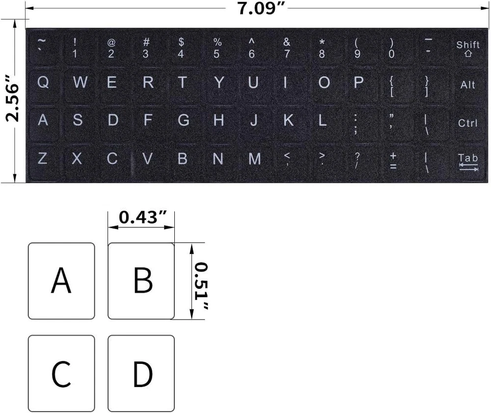 English Keyboard Stickers, 2 Pack Replacement Black with White Font, Product Details Brand: CaseBuy Color: English Item dimensions L x W x H: 7.09 x 2.56 x 0.01 inches Recommended Uses For Product: Laptop Theme: Keyboard Stickers Cartoon Character: American Special Feature: Forsted Texture, Reusable, Scratch Resistant, Water Resistant Number of Pieces: 48 Style: Minimalist Age Range (Description): Adult Reusability: Single Use Item Form: Sheet Pattern: Letter Print Indoor/Outdoor Usage: Indoor Finish Type: Matte Water Resistance Level: Water Resistant Number of Items: 2 Target Audience: English-speaking keyboard users Size: Black with White Font UPC: 602191620199 Item model number: KB-STICKER-ENGLISH Item Weight: 0.352 ounces Product Dimensions: 7.09 x 2.56 x 0.01 inches Item Dimensions LxWxH: 7.09 x 2.56 x 0.01 inches Manufacturer: CaseBuy Country of Origin: China Is Discontinued By Manufacturer: No Brand: CaseBuy Color: English Item dimensions L x W x H: 7.09 x 2.56 x 0.01 inches Recommended Uses For Product: Laptop Theme: Keyboard Stickers Cartoon Character: American Special Feature: Forsted Texture, Reusable, Scratch Resistant, Water Resistant Number of Pieces: 48 Style: Minimalist Age Range (Description): Adult Surface RecommendationMaterial: Plastic, MetalVinyl ShapeUnit Count: Rectangular1.0 Count 【DESIGN FOR】The english keyboard stickers are suitable for a variety of keyboards for Desktops, Laptops and Computer. The keyboard letter stickers are well suited for different language communication, education or a language self-learning. 【EASY TO APPLY & REMOVE】The english keyboard stickers are easy to apply and remove without leaving any residue behind. The individual keyboard replacement english stickers have been cut neatly, and there is a notch for the F and J keys to blend well with your keyboard. 【RENEW THE WORN-OUT KEYBOARD】It’s a great way to update your keyboard worn-out letter keys with a different fresh new look, so you don't have to spend a lot of money on a new keyboard. 【PREMIUM MERTIALS】The computer keyboard stickers are made of high-quality, non-transparent vinyl with a matte texture that will give you a good grip and feel close to the original keyboard. Long-lasting, durable coating, not fade for 2 years in normal use.