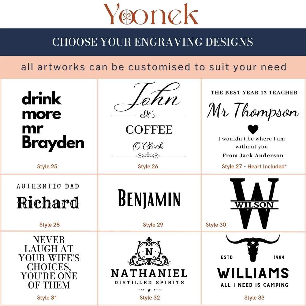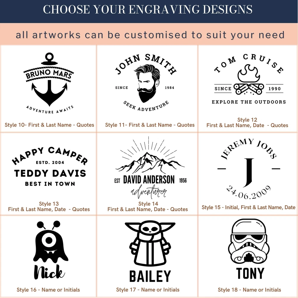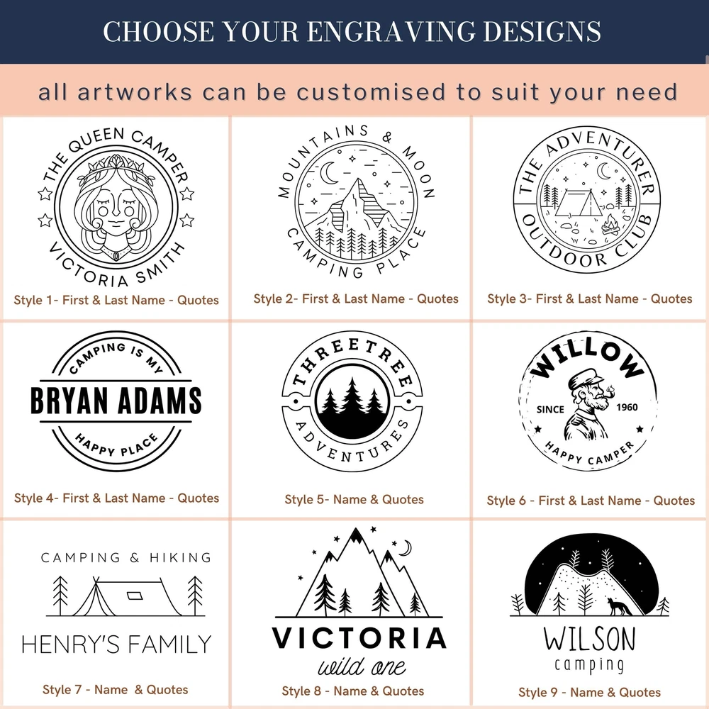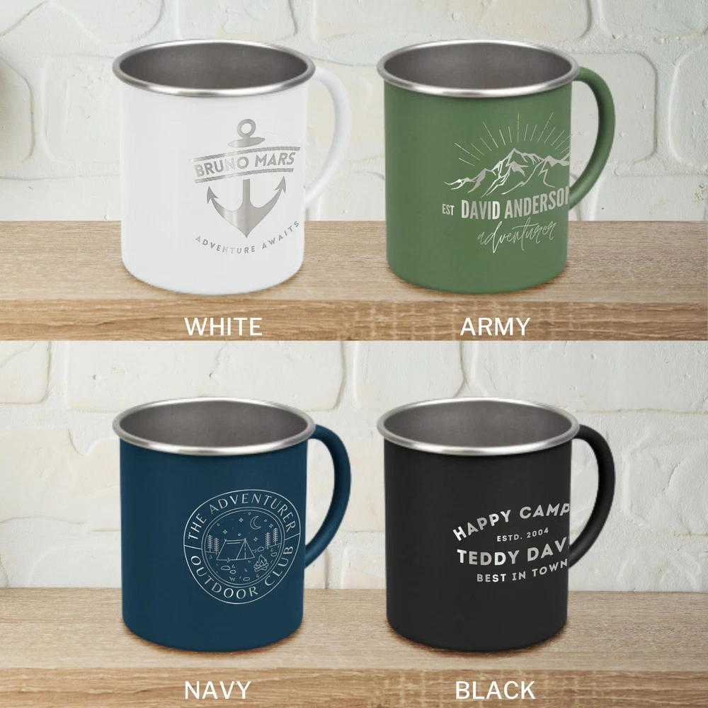 Engraved 350ml Stainless Steel Camping Picnic Mug - Matte DETAILS • Enjoy your favourite beverage from your own unique Stainless Steel Cup while on an outdoor adventure, hiking trips, tramping camping weekends, lazy beach days and picnics, activities.• Personalise it with initials, name or custom logo to complete the look of this Stainless Steel Travel Mug• Looking for something unique ? We have an extensive selection of colour & design to choose from.• Make great unique gifts for a birthday, house warming gift and pretty much anything else you can think of.• It's aesthetic and practical that can be used every single day.• Personalise your own Camping Tumbler to be given for your clients as closing gifts or your company promotion purposes with your clients names or monograms or your logo laser engraved. Our customised mugs can be corporate gift for your business partners or clients also!✔ FUNCTIONAL:- Perfect for travel, picnic, camping, outdoor activities, etc.- Alternatively, it can be used as a hot cup of tea or coffee to reflect on past adventures and dream of journeys to come.✔ LIGHTWEIGHT & DURABLE cups are made from durable stainless steel.✔ PERMANENT and long lasting engraved bottles using high quality laser machine, an alternative better options for vinyl stickers that will easily peel off over time.✔ STYLISH cup with up to 52 engraving design options.✔ SAFE This cup is BPA free.✔ CARE INSTRUCTIONS:- Not suitable for microwave, dishwasher or freezer use.- Avoid using abrasive cleaners or scourers. SPECIFICATIONS Dimensions: Diameter x Height: 84 x 89 mm (3.3" x 3.5" ) ( not includes handle) Volume: 350 ml (12 oz) Material: Stainless Steel, Powder coated Matt Finish, with Silver trim. Technique: Laser Engraved. Personalise any design with any name, date, available template design or custom logo, your own image. HOW TO ORDER 1. Select your preferred colour.2. Choose single or double side engraving.3. Type in Engraving Style and exact order you want it engraved based on our provided Design Template Options. You can add additional instructions in ( ) brackets. Example:(Style 11)John SmithSince 1984Seek Adventure ▸If you want to use your own logo, please attach/ send us your file once you finish . Please note to attach the highest resolution file as possible to avoid quality issues Not all files are scanned prior to manufacturing, if you're not sure, please send us an email after placing the order to confirm if the file is of an acceptable quality. ▸You can combine or pick any font, icon, style, etc between our provided designs, or choose not to include a date, title or icon for example. All artwork based on our available design is free of charge. ▸If you don't like any of our template and want to create your own bespoke artwork design, please feel free to contact us with any questions you may have, a small additional fee may apply. DELIVERY TIME Processing Time: Upon placing an order, our dedicated team initiates the meticulous process of designing your artwork(s), collecting your item(s), crafting your personalised product(s), and carefully packaging it. The duration of production varies based on the chosen production process and the complexity involved. Please find below estimated turnaround times: Item Type Processing Time* Rush Order(25% Surcharge)* Non-Personalised Items 1-2 business days - Personalised Items 2-7 business days 1-2 business days Signs & Hoops 3-10 business days 1-3 business days * The provided processing time does not include the duration required for customer artwork approval. Timely responses to artwork confirmation emails are crucial, as any delays in approval will extend the overall processing time.Rush Order option is available during checkout. Shipping Time: We send out your order when all items are ready. The delivery time varies based on your chosen shipping options and location. After shipping, you'll get a confirmation email with a tracking number. If there are no scans in the first 24 hours, don't worry—sometimes the system takes a day or so to catch up. Our carriers estimate delivery times: Region/Country Standard Shipping* Express Shipping* Australia 2-4 business days 1-3 business days New Zealand 5-8 business days 2-5 business days United States 6-9 business days 3-6 business days Canada 6-9 business days 3-6 business days United Kingdom 6-8 business days 4-6 business days Europe 6-14+ business days 4-10+ business days Middle East 6-12+ business days 4-8+ business days Singapore 5-7 business days 3- 6 business days Hong Kong 5-9 business days 3-6 business days Rest of Asia 3-14 business days 1-5 business days Rest of the World 6-14+ business days 1-5 business days * Please be advised that the provided delivery estimates are general approximations, and the actual delivery times may vary based on factors beyond our control. These factors include the load volumes of our shipping partners, deliveries to regional areas, and potential customs delays. While we make every effort to expedite the process, however we cannot accept responsibility for delays resulting from such circumstances. * Additionally, delivery estimates are subject to change due to various variables. * Express shipping specifically affects the speed of your order's delivery after we've processed it, relying on the efficiency of the postal service. It does not expedite the internal processing time needed to create your item, which is addressed by our Rush Order service option. Should you wish for a quicker processing time, a 25% fee on the order's value will be applied. This option is conveniently available during checkout. Engraved 350ml Stainless Steel Camping Picnic Mug - Matte DETAILS • Enjoy your favourite beverage from your own unique Stainless Steel Cup while on an outdoor adventure, hiking trips, tramping camping weekends, lazy beach days and picnics, activities. • Personalise it with initials, name or custom logo to complete the look of this St
