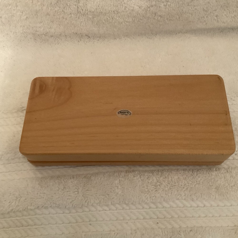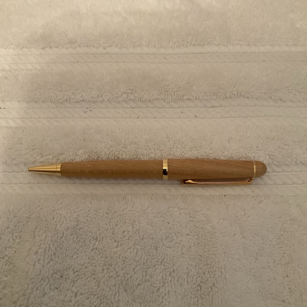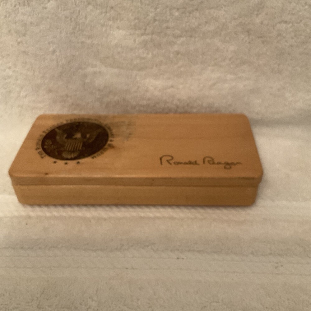 The product is a wooden ballpoint pen and case set engraved with "Ronald Reagan." It is a collectible item related to politics, specifically associated with President Ronald Reagan. The pen is made of wood and is likely a souvenir or memorabilia from the United States.