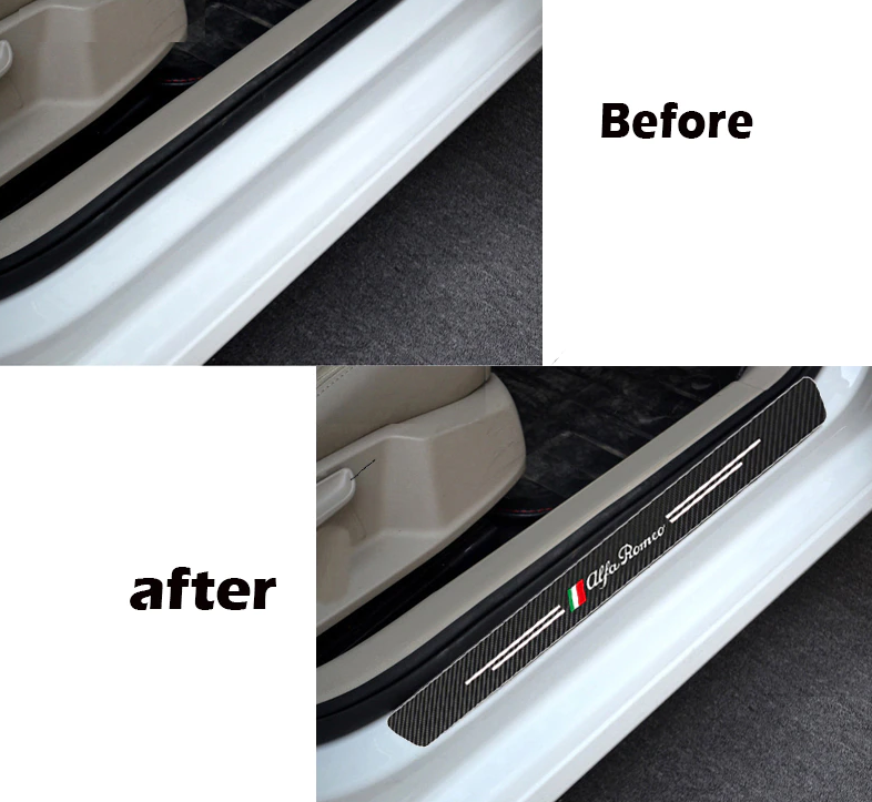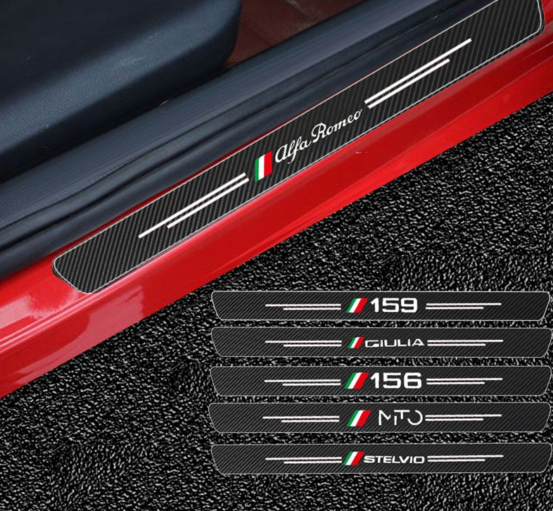 Carbon Fiber Car Door Sticker For Alfa Romeo Giulia Giulietta 159 156 MITO Stelvio 147 Sportiva Auto Accessories Please measure your car door sill before ordering !!! 1.100% Brand New material and high quality 2.Material:Carbon fiber car 3D 3.back with glue,stick directly. 4.Size:2pcs46.5*3.2cm and 2pcs 23.2*3.2cm