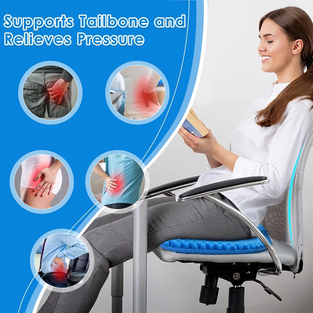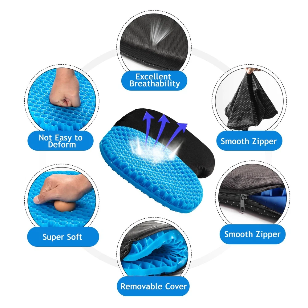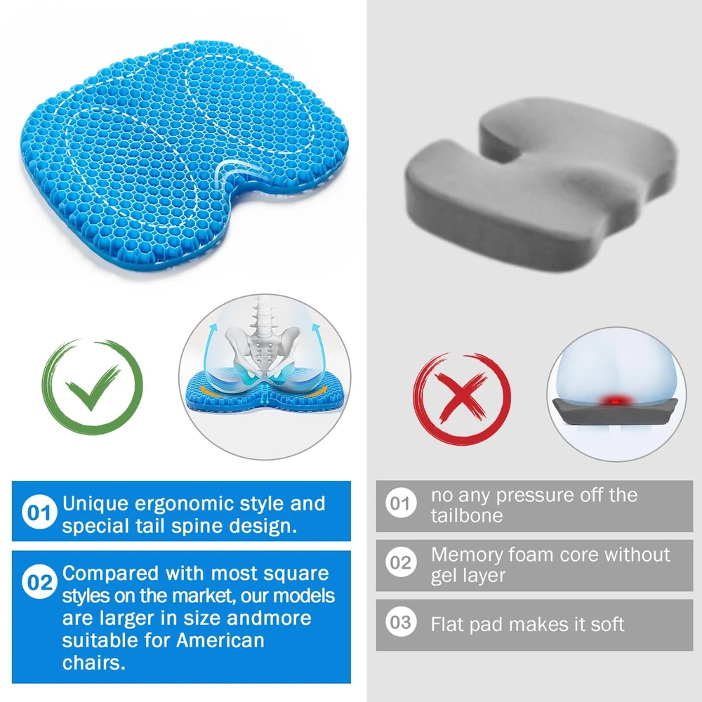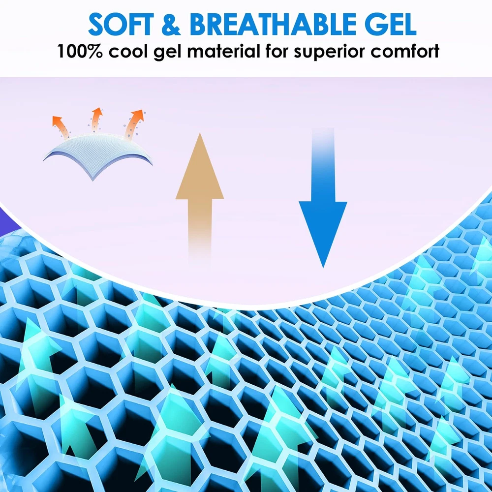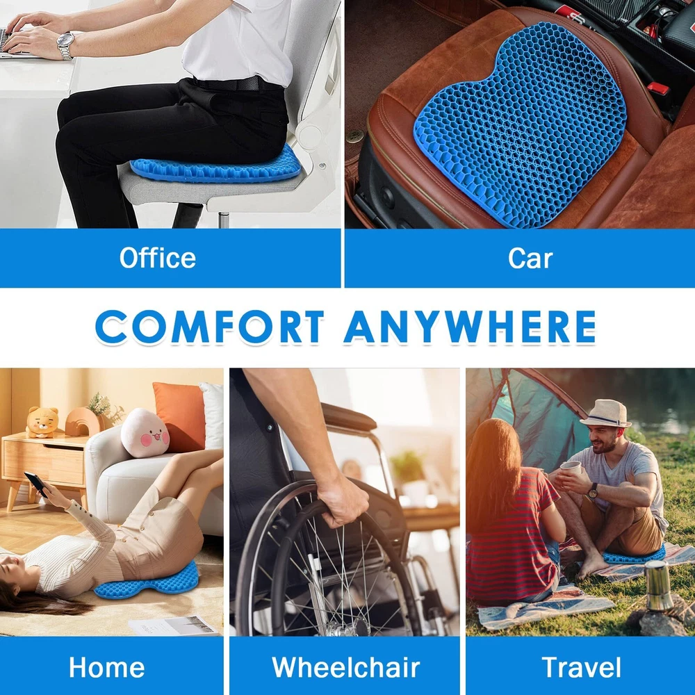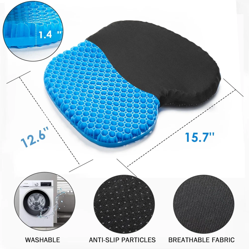 đăEXCELLENT ALTERNATIVEăThis small-sized, high-quality elastic gel pillow measures 12.6 x 15.7 inches, with a thickness of 1.4 inches, making it more suitable for individuals with a smaller stature or children. It conforms to the shape of your hips, providing soft support and enhancing comfort during extended periods of sitting. ăEXCELLENT ALTERNATIVEăThis large, high-quality elastic gel pillow measures 18.9 x 15 inches, with a 2-inch double thickness for can provide comfortable experience, which can increase the time spent sitting for long periods of time. It is conforms to the shape of your hips, thus providing soft support. ăRELAX AND FOCUSă With unique egg cushion design, we give you double thickness support, which makes it a high-quality gel cushion. It fits 99% of chairs, , improve your comfort. ăWIDELY USEDă Great for office, home, travel, car seats or wheelchair stadium or bleachers. Once the cloth cover is removed, it can be used in wet areas, as well as swimming, showering, boating, kayaking, and on a chair on an outdoor patio. It dries quickly after getting wet. ăPERFECT GIFTă Full gel pressure relieving seat cushion is an ideal gift for family and friends; Each cushion comes with a full one-year warranty that protects against any damage or defects. If your seat cushion is damaged, send it back for a FREE replacement.