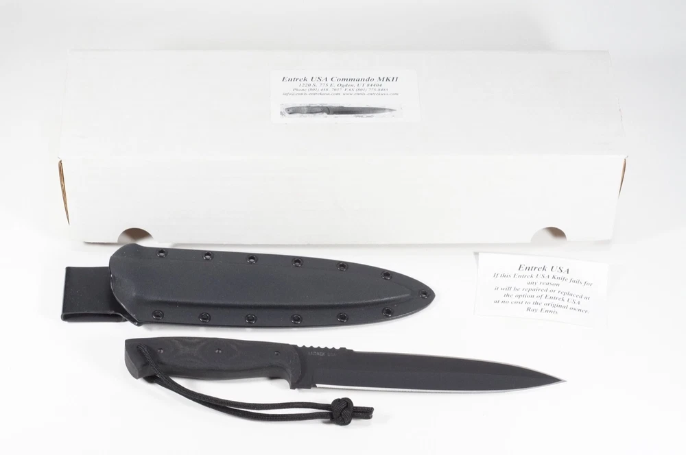 This is a black Entrek USA Commando MKII Dagger with Kydex sheath made by Ray Ennis. It is unused/new. It is my understanding that Ray Ennis retired from knife making due to health issues. Please see photo with ruler for size, only what is pictured is included. This is part of a collection of both modern and antiques knives and swords that we are selling for their owner. Please see our other listings for more fine knives. We strive to be as accurate and thorough as possible in our listings. Returns are no problem for any reason, we want you to be satisfied with your purchase. We generally ship next business day from purchase.