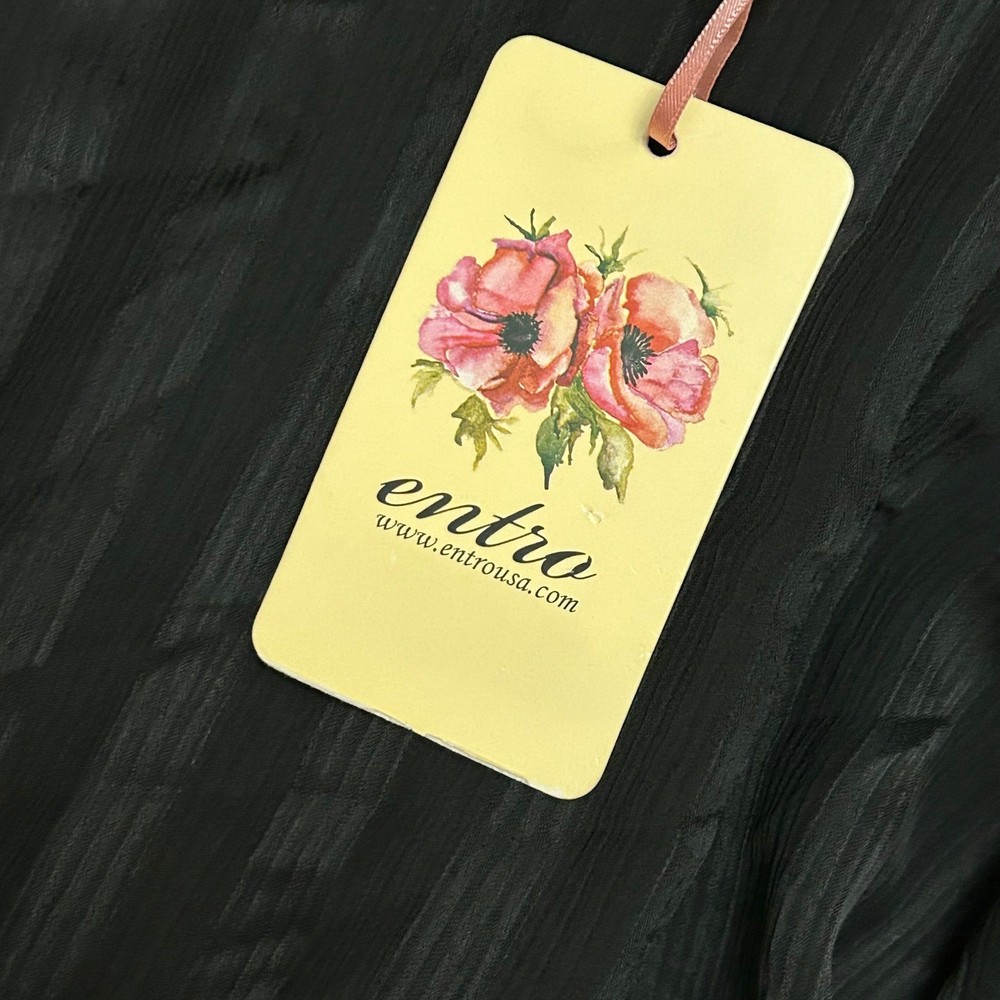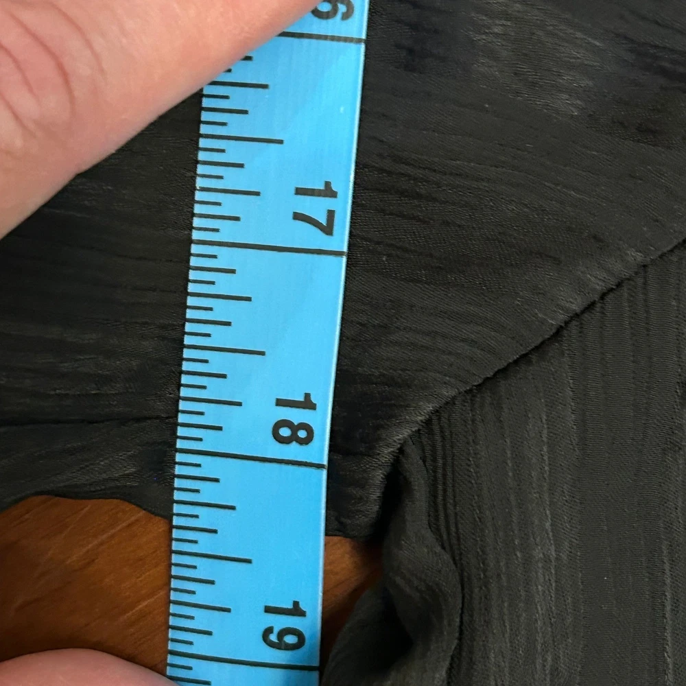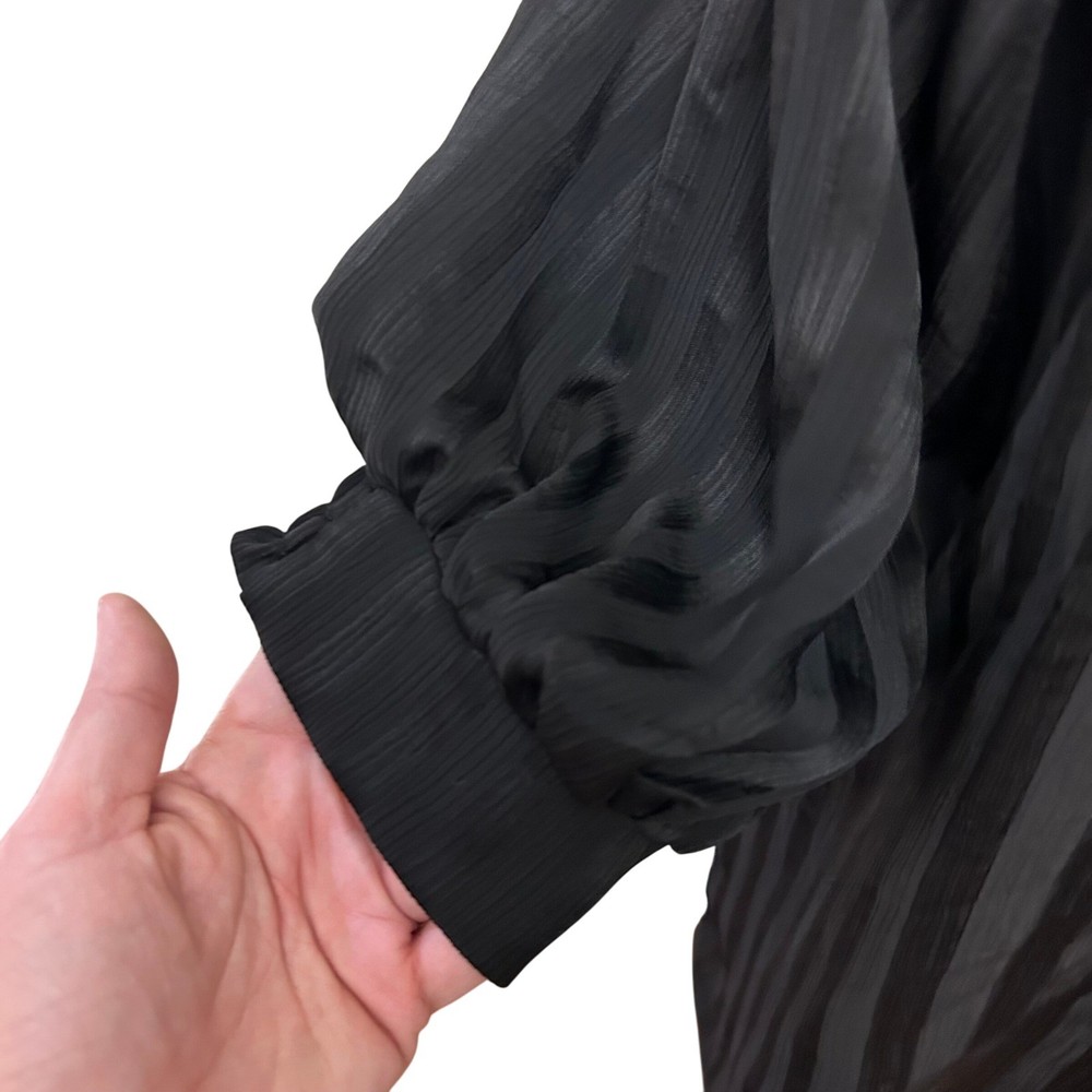 Elevated style exudes from this sophisticated black blouse. Vertical stripes add a touch of dimension, while the elegant puff sleeves create a flattering silhouette. A single button at the back adds a subtle closure detail. This chic top is perfect for making a statement at the office, looking polished on a casual date, or adding a touch of refinement to a weekend brunch outfit. Measurements: • Pit to pit: 18 inches • Length: 22.5 inches Color: Black Type: Blouse Department: Women Material: Polyester Neckline: Round Neck Sleeve Length: 3/4 Sleeve Sleeve Type: Puff Sleeve Accents: Button Pattern: Striped Features: Lightweight, Breathable, Easy Care Fit: Regular Keywords: black blouse, striped top, puff sleeve blouse, womens top, size S, entro, career blouse, casual top, dressy blouse, blouse, top, womens fashion, business casual, going out top