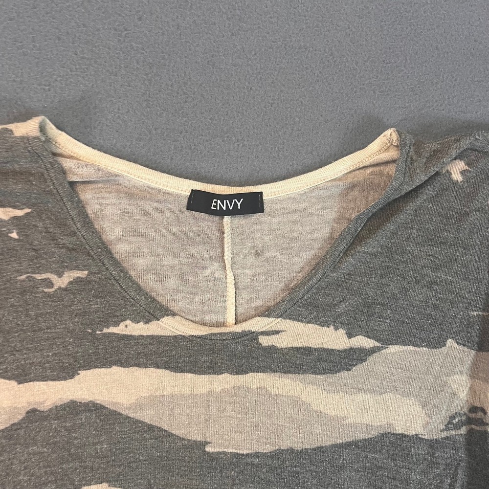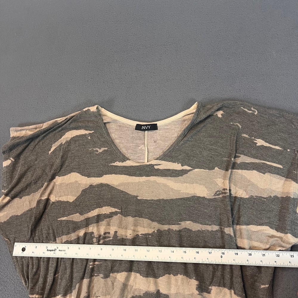 This Envy Women's Sz Med Camo Short Sleeve Shirt is a stylish and versatile addition to any casual wardrobe. Made from a comfortable blend of polyester and rayon, this shirt features a trendy batwing/boxy fit with a classic round neck and short sleeves. The gray camouflage pattern adds a fashionable touch to this basic yet colorful top, perfect for all seasons including summer, fall, and spring. Ideal for everyday wear, this shirt from Envy is a must-have for women who appreciate a comfortable and trendy style.