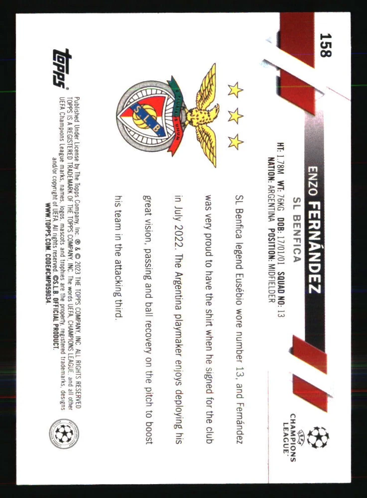 Team: SL Benfica Features: RC Type: Sports Trading Card Year Manufactured: 2022 Sport: SOCCER Player|Athlete: Enzo Fernández Autographed: No Card Number: 158 Set: 2022-23 Topps UEFA Club Competitions Manufacturer: Topps Season: 2022 Graded: No