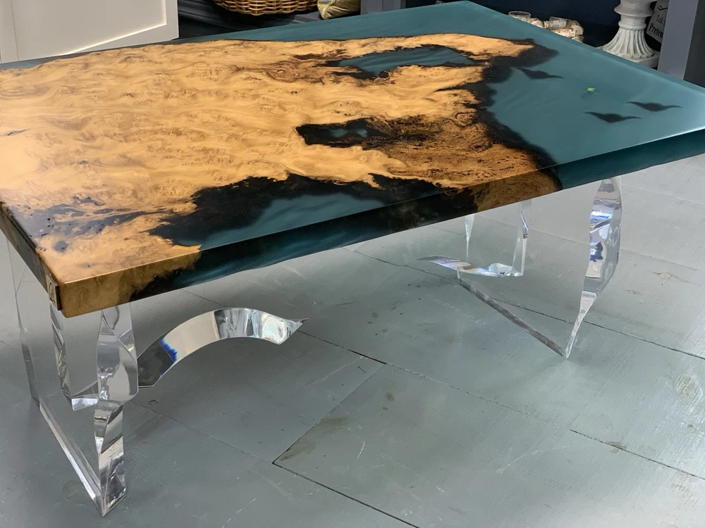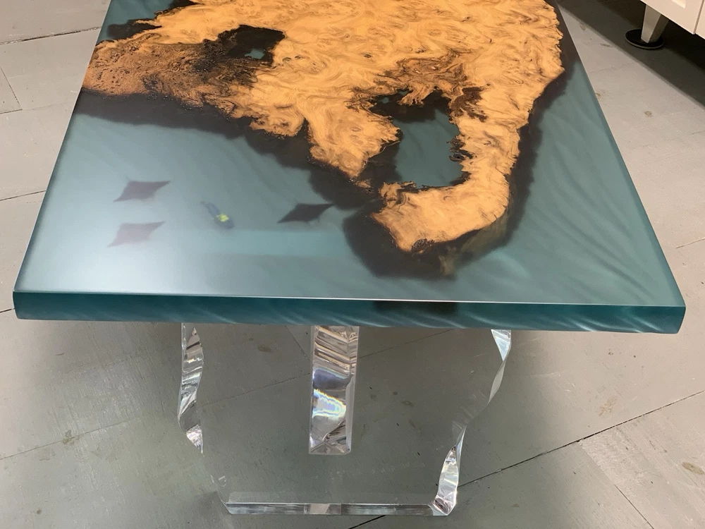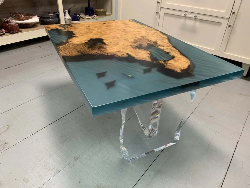 This is a unique and handcrafted "Epoxy Ocean Table Diver Scene" coffee table by Catawba Artisan. The table features a rectangular shape with a resin tabletop showcasing a diver scene in a multicolor ocean theme. The table is made of 3D printed figures, burl wood, resin, and acrylic, with a mid-century modern style. It includes hand carved features, a live edge wood design, and a carved acrylic base, making it a one-of-a-kind piece for your living room and is hand made in beautiful Lenoir North Carolina USA.