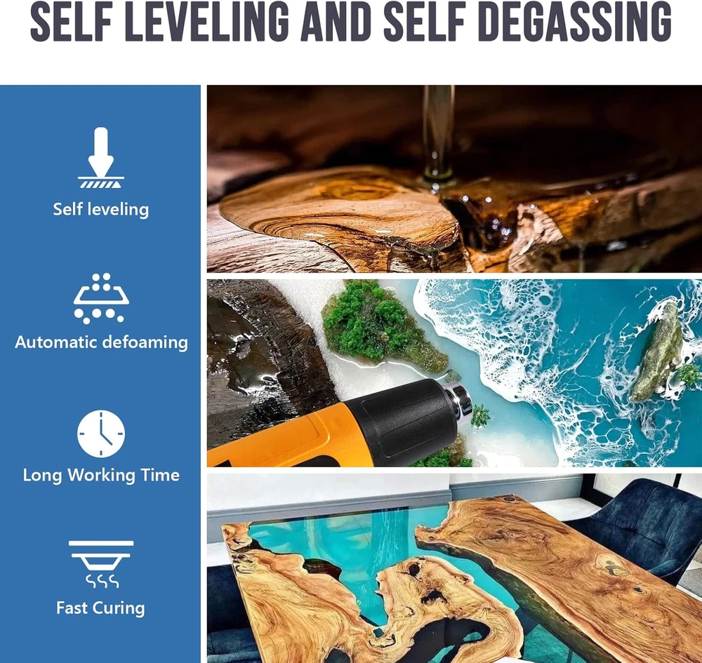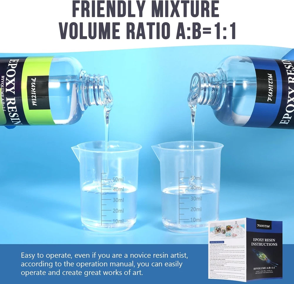 💎 [EASY TO USE AND FAST CURING] Simply mix the resin and curing agent in a 1:1 volume ratio to start using. It has a 45 minute working time, making it perfect for beginners and allows time to mix bright colors for eye-catching creations. The easy to pour epoxy resin formula can self level and smooth. It will quickly solidify within 8-24 hours; Even if you haven't been exposed to it before, you can start quickly. 💎 [SELF DEFOAMING] Our formula adds defoamer, which automatically releases trapped bubbles and has strong defoaming ability. It is recommended that each layer should not exceed 1/4 inch, which can be quickly and completely eliminated. To achieve perfect surface treatment in cold weather: preheat the resin and hardener before use. Our epoxy resin kit is safe, reliable, and non flammable. 💎 [ULTRA HIGH GLOSS CRYSTAL TRANSPARENT EPOXY RESIN] Professional grade transparent epoxy resin and hardener are a perfect formula that can make your art vibrant, long-lasting, scratch resistant, moisture-resistant, rock hard, and have a glass like surface treatment, long-lasting, ultra transparent appearance, and will not turn yellow. 💎 [SUITABLE FOR BEGINNERS & PROS] Resin set including 8 oz resin, 8 oz hardener, comes with a detailed instruction, which introduces common problems and solutions in resin production. Beginners can conduct a small amount of testing before work. 💎 [WIDELY USED] Our resin is suitable for various DIY process projects, such as making jewelry, coasters, wooden furniture, tabletops, countertops, paints, etc. It fits perfectly with the silicone mold and will not cause the mold to tear. Don't limit your imagination, create works that you enjoy. If there are any issues (leakage, loss, usage issues), please feel free to and we will provide a replacement or refund guarantee. Product Description MEASURE 1:1 BY VOLUME Measure 1:1 ratio (by volume、Not weight),then pour clear epoxy resin together into a container. STIR IN THE SAME DIRECTION Stir slowly art resin in one direction until no swirls are seen at all. Scrape the sides and bottom thoroughly.Ensure uniform mixing at all positions. POUR PIGMENT OR SEQUINS Stir thoroughly until the color is even in the resin, and quickly pour art resin into model. POUR RESIN IN MODEL The thin the resin, the better self equal effect.You have up to 45 minutes to complete your project and DIY to achieve your creativity. MOLD FRIENDLY,QUICK CURING Mild heat dissipation without damaging the mold;The resin dries after 8 hours, solidifies after 24 hours, and reaches full hardness after 72 hours. LET'S MAKE GREAT WORKS OF ART TOGETHER FUHITIM epoxy resin is suitable for making small jewelry and coasters; It is also suitable for creating large-scale artworks such as riverbed tabletops, coatings, and casting; Hurry up and create your own unique artwork! Package Of Epoxy Resin Kit 8 oz Resin 8 oz Hardener, 2 100ml Measuring Cups 2 50ml Measuring Cups 5 Wooden Stirrers 2 Pair of Gloves Detailed Manual What You Get From FUHITIM Crystal Clear Epoxy Resin Kit? Clear and Self Leveling Our casting resin is easy to Self-leveling, high-glossy, no yellowing, No Bubbles,which will remain clear all the time. Premium Quality Professional team research and development,our customized epoxy clear is made with premium quality, being 100% safe for use and low odor! Multi-Purpose and Fits for All People Suitable for beginners and artists, Can be used for multiple purposes such as DIY resin art, jewelry making,crystal clear coating, casting ,tabletop and more. KIND REMINDER A:B=1:1 by volume : Double check the proper 1:1 by volume mix ratio was used. esin and hardener : Make sure you used resin and hardener and not all resin or all hardener. ully mixed : Upon mixing, be sure to scrape sides and bottom of mixing container to ensure all resin and hardener are fully blended. Failing to do so can result in soft spots in coating. Pouring : Never scrape or brush the sides or bottom of the container you just mixed. There will always be an unmixed portion which can be dislodged and will leave a wet or sticky spot on your coating. Temperature : If the temperature drops below 60 ° F during the initial curing of epoxy resin, it may affect the self-leveling and curing time of epoxy resin; If the temperature is too low, it is recommended to increase the temperature of the epoxy resin and the surrounding environment to 80 ° F+. The resin dries : The resin dries after 8 hours, solidifies after 24 hours, and reaches full hardness after 72 hours.