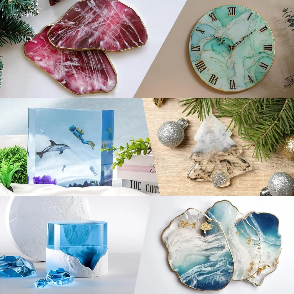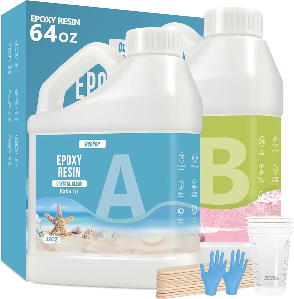 【Crystal Clear Resin Epoxy】: Professional and perfect resin formula, crystal clear, easy to mix, less bubbles, and self defoaming and self leveling, low odor, safe and non-toxic, pigments do not settle after mixing, you can make your resin creations colorful and easy to complete the production. 【Quality Resin】 : After curing of OcePor's epoxy resin, the artwork is hard as a stone, with a shiny surface, perfect texture, friction-resistant and durable, and does not turn yellow with long-term use. Make your artwork vibrant and perfectly textured with a glass-like surface. 【Easy to Use, Fast Curing】 : The casting resin is easy to use, just mix at 1:1 volume ratio and start using. The resin cures quickly within 8-24 hours. Ideal for beginners and professionals alike, and makes it easy to create beautiful artwork. 【Art Epoxy Resin Kit】 : Includes 32OZ clear resin, 32OZ clear hardener, 4 x 240ml measuring cups, 10 x wooden stirring sticks, 2 x gloves, and detailed instructions on common problems and solutions during use. Everything you need for your creations. 【Wide Range of Uses】 : Our art resin is perfect for casting, coating, artwork, suitable for coasters, countertops, crafts, jewelry making, painting, molds, woodwork and more. It fits perfectly with silicone molds and won't cause molds to tear. Please feel free to if you have any problems during use, we are here to serve you! Product Description Why Choose Us? OcePor Offers A Wide Range Of Resin And Related Products At Affordable Prices, Making It Easy To Enjoy The Crafting Process And The End Result. Crystal Clear Self Leveling Resists Yellow High Gloss Low Odor Bubble Free OcePor Crystal Clear Epoxy Resin Tips To Epoxy Resin Correct Measurement: A:B=1:1(By Volume), Make Sure You Used Resin And Hardener And Not All Resin Or All Hardener. Fully Mixed: Stir Thoroughly And Slowly Until Uniform And Clear. Pouring: The Mixed Resin Needs To Be Poured Into The Mold Within 45 Minutes. Do Not Scrape The Sides Or Bottom Of The Mixing Container When Pouring. Working Temperature: 60°F-75°F. Curing: Resin Dries In 8 Hours, Cures In 24 Hours And Reaches Full Hardness In 72 Hours. 1. Measure 1:1 By Volume Measure 1:1 ratio by volume, then pour epoxy resin together into a container. 2. Stir in The Same Direction Stir thoroughly and slowly until uniform and clear. Scrape the sides and bottom thoroughly. 3. Pour Sequins, Micas or Pigment Fully mix our resin with mica powder, resin tint, glitter to create perfect creations. 4. Pour Resin Into The Mold The thin the resin, layered pouring, the better self equal effect. Resin dries In 8 hours, cures in 24 hours and reaches full hardness in 72 hours.