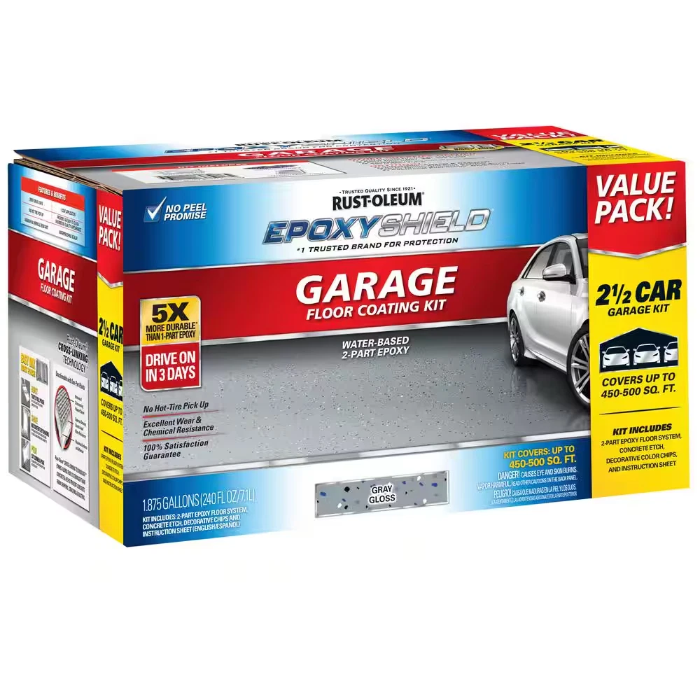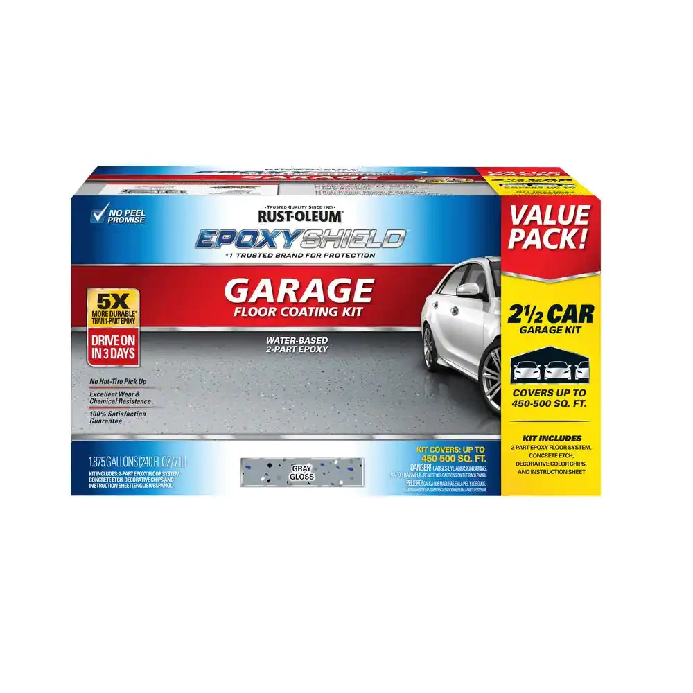 5x more durable than 1-part epoxy on interior concrete floors Waterproofing sealer resists chemicals and hot tires on concrete Use on garage floors and more, covers up to 500 sq. ft. Rust-Oleum EpoxyShield 240 oz. Gray High-Gloss Low VOC 2.5-Car Garage Floor Kit beautifies and protects your garage floor or workshop area. Specially formulated, 2-components, water-based epoxy floor coating provides superior adhesion and durability. Designed for one coat coverage, easy to apply and provides professional-looking results.