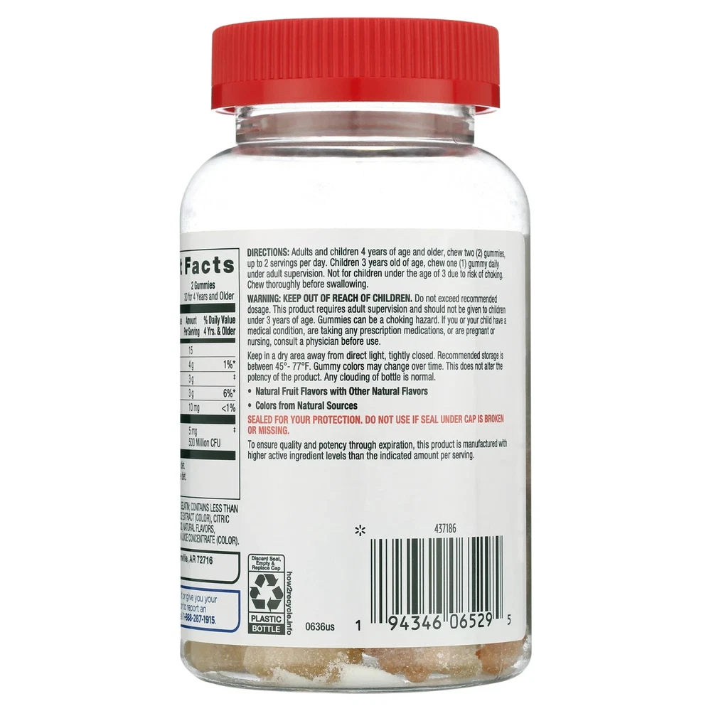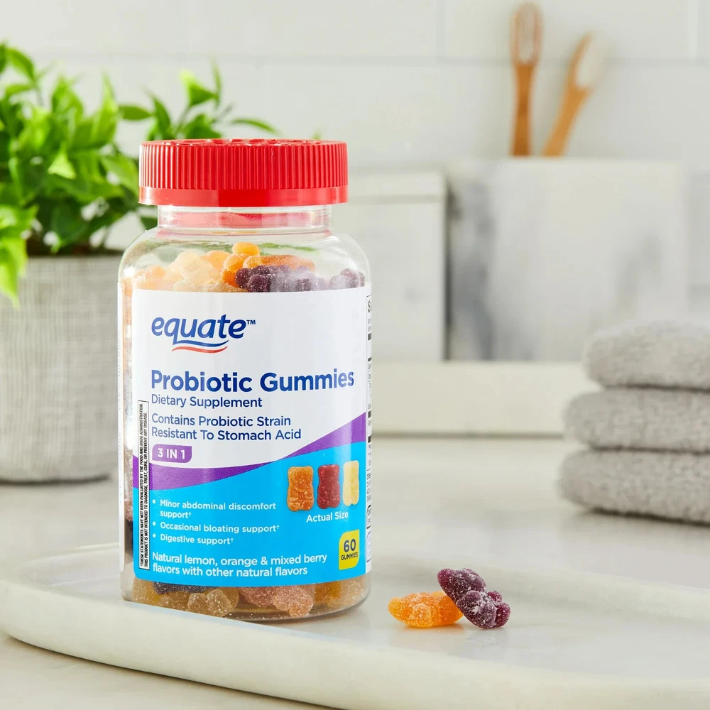 About this item Helps maintain normal intestinal function and regularity Contains a probiotic strain resistant to stomach acid Assists with minor discomfort, occasional bloating, and digestive health Each bottle offers a 1-month supply with 60 naturally-flavored gummies Free from synthetic dyes, artificial flavors, gluten, lactose, and high fructose corn syrup Equate brand ensures reliable and consistent health care solutions Formulated for both men and women seeking digestive health support