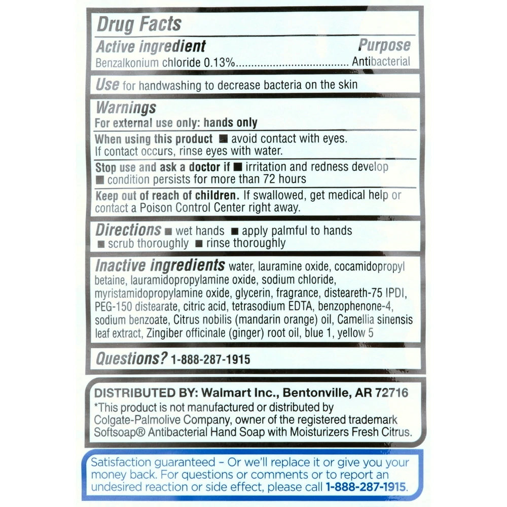Equate Citrus Antibacterial Liquid Hand Soap delivers a bright, fresh scent in every drop. This germ fighting soap is gentle on hands and is perfect for your bathroom or kitchen sink. Your family will enjoy the smooth lather and wonderful smell that this soap offers. It comes in a large 50 fluid ounce bottle, so you'll be stocked on your favorite soap for weeks. The large bottle makes it easy to refill dispensers at your kitchen or bathroom sinks. Treat your hands to a gentle clean every time with Equate Citrus Antibacterial Liquid Hand Soap. Making the right health decisions can be challenging. With a complete range of products and simple solutions, Equate allows you to take care of your family with confidence. Equate Citrus Antibacterial Liquid Hand Soap, 50 fl oz Compare to Softsoap Antibacterial Hand Soap with Moisturizers Fresh Citrus Active Ingredient With light moisturizers Crisp, fresh scent Helps kill harmful germs