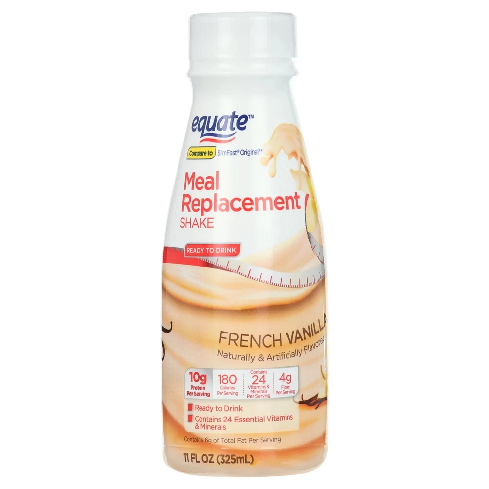Product details Equate Meal Replacement Shakes combine good taste with strong health benefits. They're ready to drink straight from the box and require no extra preparation. Similar to SlimFast Original, these shakes contain enough nutrients to serve as a full meal when necessary. They deliver 10 grams of protein, four grams of fiber, and 24 vitamins and minerals per serving. Made with a naturally and artificially flavored formula, these beverages are safe for those adhering to a special diet or weight loss program. Curb hunger quickly or get a convenient snack when you need it with our Equate Meal Replacement Shakes. Making the right health decisions can be challenging. With a complete range of products and simple solutions, Equate allows you to take care of your family with confidence. Equate Meal Replacement Shake, French Vanilla, 11 fl oz, 12 Count: Ready-to-drink shakes 10g of protein + 24 essential vitamins and minerals 4g of fiber Naturally and artificially flavored Can be used as a meal replacement or nutritious snack Compare to SlimFast Original Delicious vanilla flavor