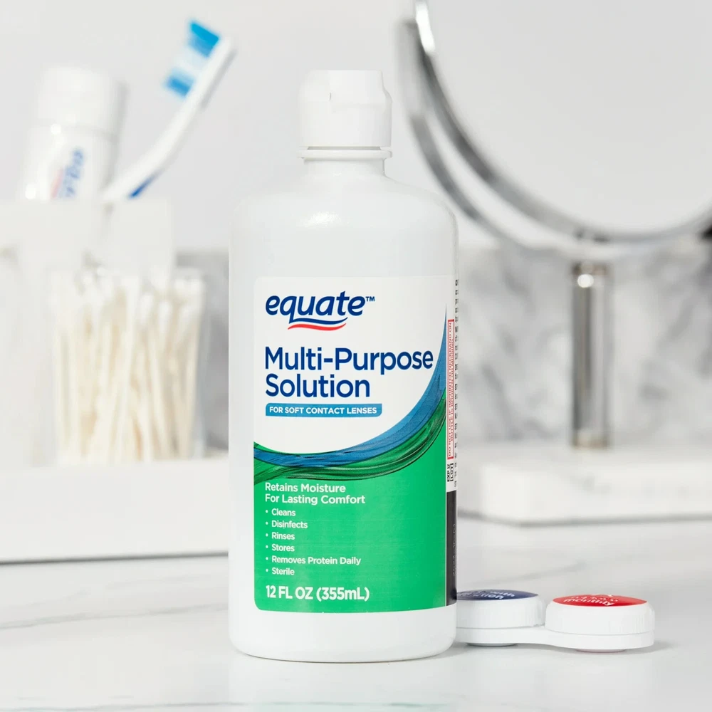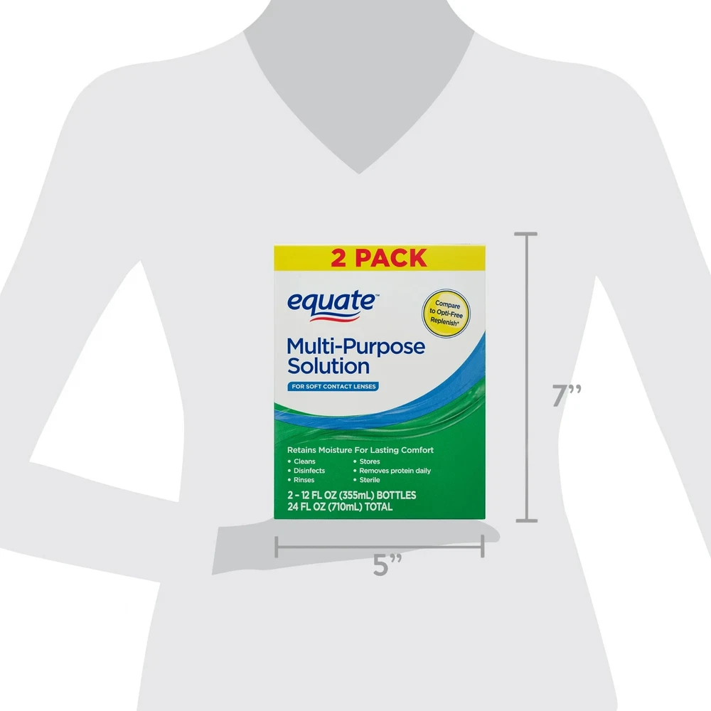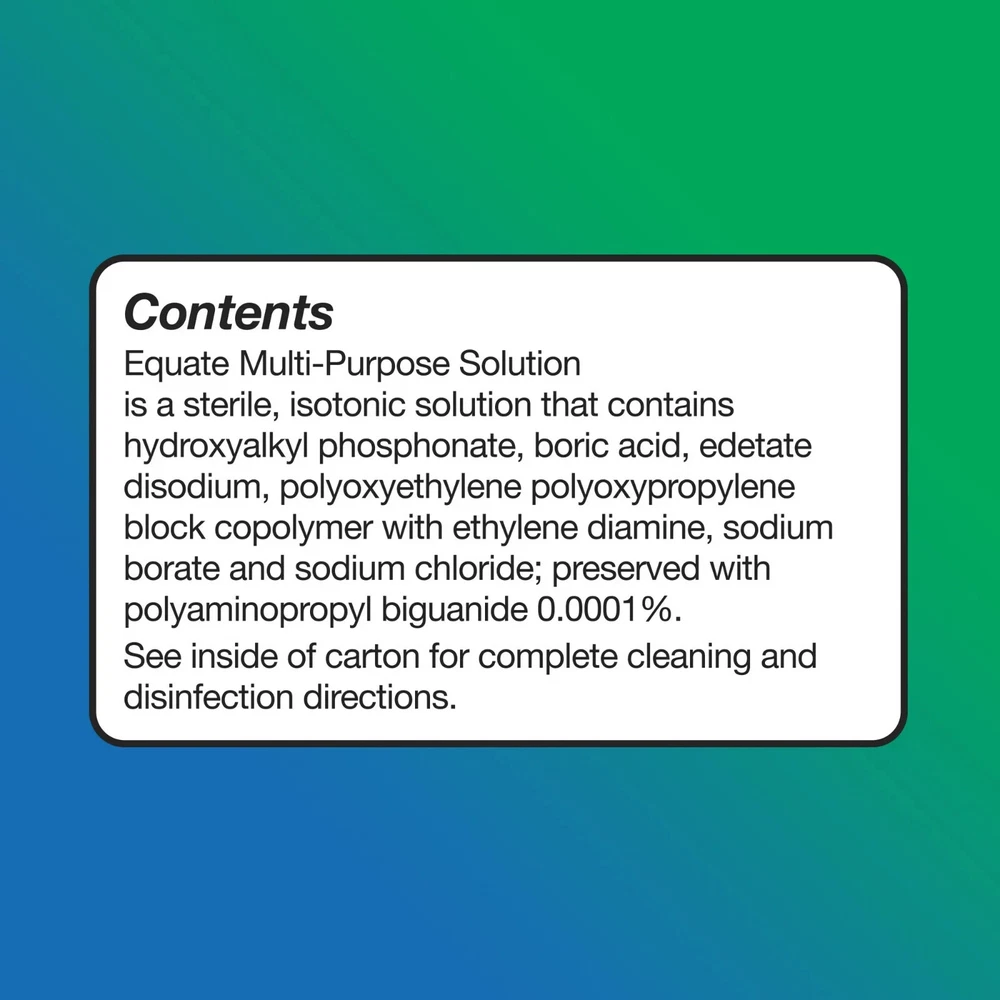 About this item Sterile multi-purpose disinfecting solution Retains moisture for lasting comfort For soft contact lenses Removes protein daily For rinsing and storage The twin pack contains (2) 12 fl oz bottles WARNINGS: Failure to discard solution from lens case after each use or use of water to care for your lenses may lead to contamination resulting in eye injury and potential loss of vision. See accompanying instructions for additional important safety information Not for use with heat disinfection If you are allergic to any ingredient in this product, do not use See inside of the carton for complete instructions and important safety information Precautions Never re-use this solution Keep the bottle tightly closed when not in use Store solution at room temperature Use before the expiration date marked on the carton and bottle Discard the remaining solution within 90 days after opening Keep out of reach of children Do not use if the imprinted neckband on the bottle is broken or missing Equate Multi-Purpose Solution Twin Pack, 12 fl oz, 2 Count