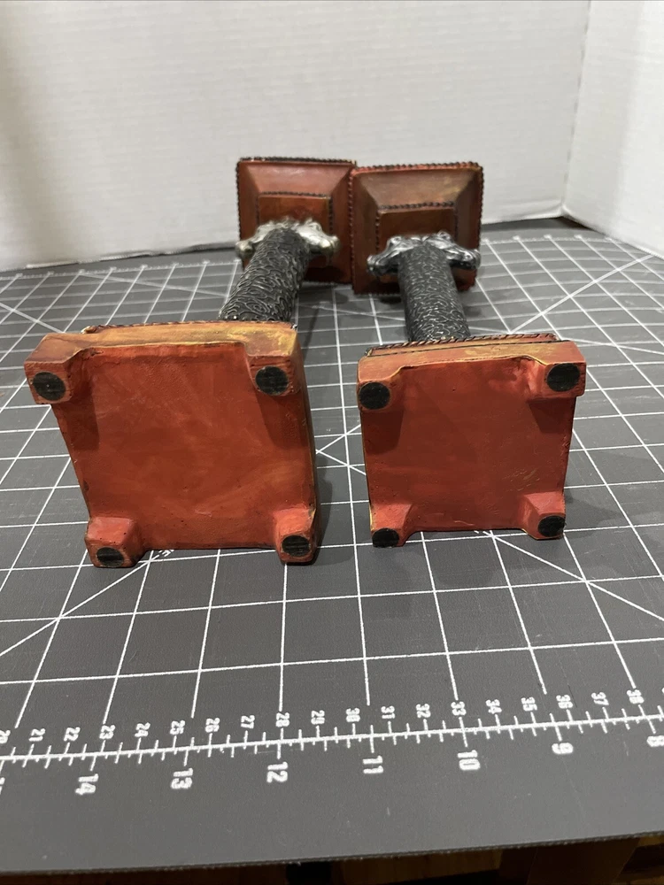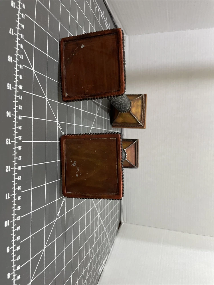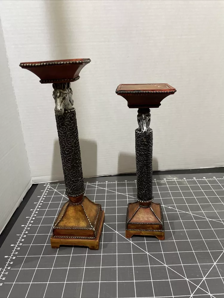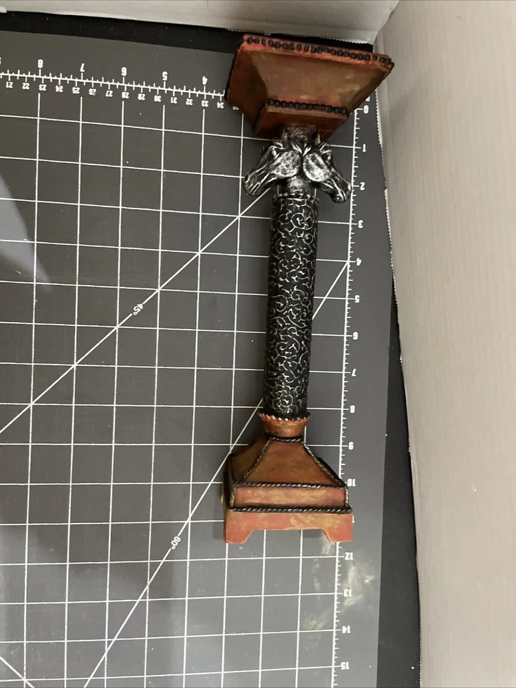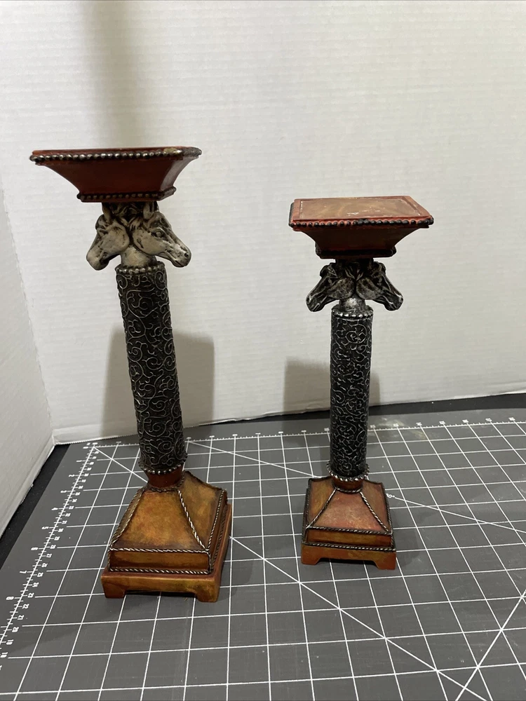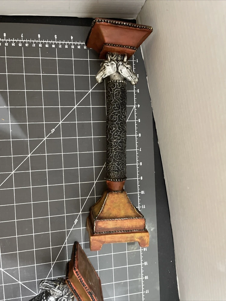 Add an elegant touch to your home decor with this beautiful Equestrian Candle Holder Pair. The square shape and medium size of these candle holders make them suitable for all occasions and any room in your home. The heavy and hand-painted features of these candle holders add a touch of sophistication to your interior. These candle holders are made of high-quality resin and metal, with a matte finish and silver and brown color combination. They are designed with an equestrian style and pattern, making them a perfect addition to your collection of decorative collectibles. Clean these candle holders with a damp cloth and enjoy the warm glow of your candle in them. This original and unboxed set weighs 3 lb 14 oz and measures 10 inches and 12 inches in height.