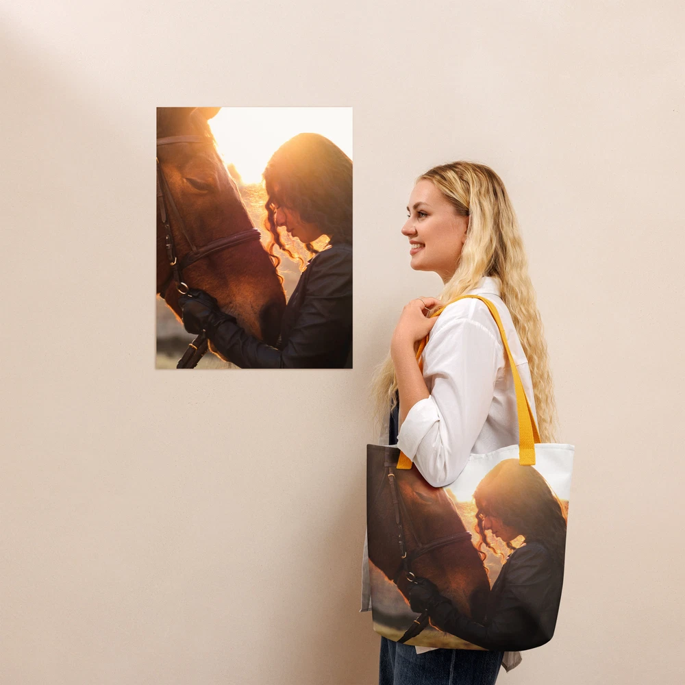 Carry your love for horses wherever you go with our beautifully designed tote bags! Perfectly blending style, durability, and practicality, these tote bags are a must-have for horse lovers and anyone on the go. Unique Designs: Featuring stunning equestrian-inspired artwork, from elegant silhouettes to charming horse portraits and western patterns, these totes add a touch of personality to your everyday look. Durable and Reliable: Crafted with high-quality materials, these tote bags are built to last. With reinforced stitching and sturdy straps, they’re perfect for carrying everything from books to groceries. Spacious and Practical: Measuring 15"x15", they offer ample space to fit all your essentials. Whether you're heading to the barn, running errands, or enjoying a day out, these totes are your perfect companion. Eco-Friendly Choice: Reusable and environmentally conscious, these tote bags help reduce waste while keeping you stylish. Easy to Care For: Machine washable and fade-resistant, they’re designed to stay vibrant and beautiful no matter how often you use them. From a quick trip to the farmer’s market to a day at the stables, these tote bags combine practicality and elegance for any occasion. They also make a thoughtful gift for the horse lover in your life. • 100% polyester • Bag size: 15″ × 15″ (39 × 39 cm) • Capacity: 2.6 US gal (10 l) • Maximum weight limit: 44lbs (20 kg) • Dual handles made from 100% natural cotton bull denim • Handle length: 26″ (67 cm), width 1″ (2.5 cm)