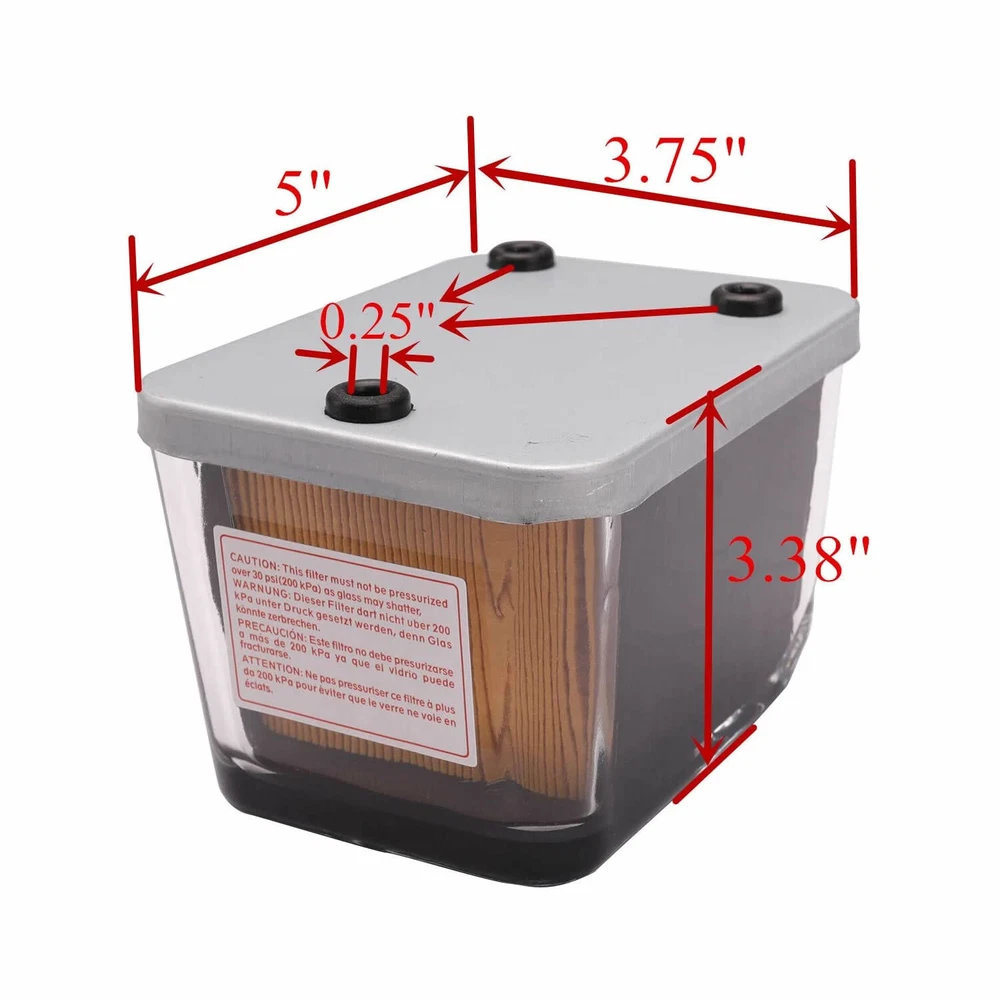 AR50041 Snap-on Fuel Filter Replacement for John Deere 20 30 40 50 55 Series Tractor with Transparent Bowl 40 Micron 820 930 1035 1120 1350 1520 2150 2355 2450 2650 3150 Replace WK13001 Product Description Fitment:Replacement for John Deere 20 30 40 50 55 Series Tractor 820 930 1035 1120 1350 1520 2150 2355 2450 2650 3150,Claas/Renault Tractor Series 103-52 103-54 106-54 and more. Replaces Part number:AR50041,S72182,6005009417,BF909,86370,P551130,MF1065,FF203,WK13001,ST369,33370. Feature:The filter is designed for your tractor to extend engine life.Easy to install,just snap on.Filter element rate 40 micron.Recommended to change it regularly. Transparent Bowl:With the glass transparent bowl,you could clearly know when to change the filter. Package includes:1 x AR50041 Snap-on Fuel Filter. Fitment: Claas/Renault Tractor Series 100:103-52,103-54,106-54 Series 20:820,920,1020,1120,1520,3020,4000,4020,4320,4520,4620,7020 Series 30:830,930,930VU,1030,1030OU,1030VU,1130,1530,1630,1630OU,1630VU,1830,2030,2030OU,2130,2630,3030,3130,4030, 4230,4430,4630 Series 35:1035,1035EF,1035EV,1635,1635EF,1635EV,2035,2035EF,2135,3135 Series 40:840,8440,940,940V,1040,1040V,1140,1140F,1140V,1640,1640F,1840,1840F,2040,2040F,2040S,2140,2240,2440,2640, 2840,2940,3040,3140,3340,3640,3640S,4040,4040S,4240,4240S,4440,4640,4840 Series 45:1445F,1745F,1845F,2345F Series 50:1350,1550,1750,1750V,1850,1850F,1850N,1850V,1950,1950F,1950N,2150,2250,2250F,2350,2450,2450F,2550,2650,2650CS, 2650F,2650N,2650TSS,2750,2850,2950,3050,3150,3350,3650,4050,4050E,4250,4350,4450,4650,4850 Series 55:2155,2255,2355,2355N,2555CS,2555TSS,2755,2855N,2955,3055,3155,3255,4055,4255,4455,4555,4755,4955 Series 60:4560,4760,4960 Series 7000:7800 Series 8030:8430,8630 Series 8640:8640 Combine Harvester Series:1055,1065,1068H,1072,1075,1075H,1085,1158,1166,1169HY,1174,1177,985 Replaces Part number: AR50041,S72182,6005009417,BF909,86370,P551130,MF1065,FF203,WK13001,ST369,33370