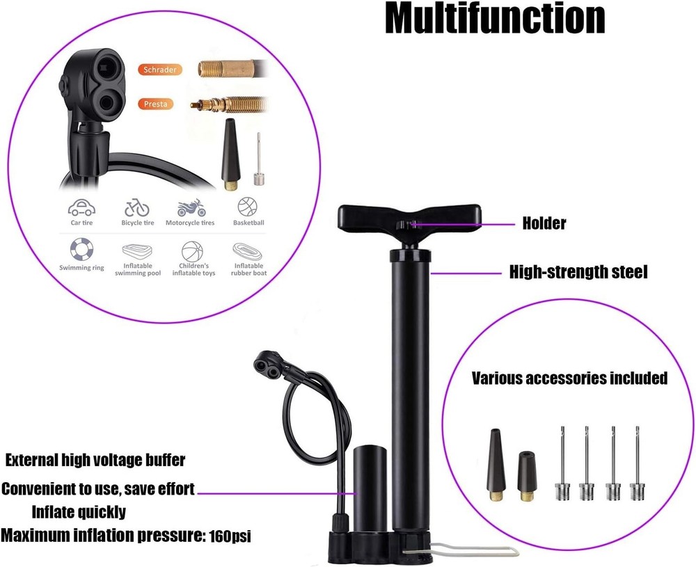 Ergonomic Bike Floor Pump - Portable High-Pressure Inflator for All Valves ‹ › ‹ › ‹ › ‹ › ‹ › ‹ › ‹ › ‹ › ‹ › Ergonomic Bike Floor Pump Portable High-Pressure Inflator for All Valves Key Features: Ergonomic Design: Comfortably contoured handle with an external booster buffer for effortless inflation. High-Pressure Capability: Achieve a maximum pressure of 160 PSI (11 BAR) – perfect for bicycles, electric vehicles, and more. Durable Construction: Comprised of inner and outer tubes made from high-strength stainless steel that are wear-resistant and crafted for longevity. Versatile Valves: Equipped to inflate Presta and Schrader valves, making it ideal for bicycles, motorcycles, cars, sports balls, swimming rings, and more. Portable: Compact and lightweight design, ensuring easy transport and convenience. Buy with Confidence: Customer satisfaction is our priority; contact us for any concerns and we promise to provide excellent service. Benefits: Effortless inflation design minimizes effort while maximizing results. Durable materials ensure long-lasting reliability through varied weather conditions. Versatile for a wide range of uses, whether for home, sports, or outdoor activities. Compact size makes it a perfect addition to any cycling gear, always ready for action. Why Choose Our Ergonomic Bike Floor Pump? Are you looking for a reliable and efficient bike pump that combines durability with user-friendly features? Our Ergonomic Bike Floor Pump offers everything you need for fast and easy inflation. Its high-pressure capability, compatibility with various valves, and portable design make it an essential tool for cycling enthusiasts and casual riders alike. Invest in the perfect companion for your biking adventures and experience the ease of inflation. Order your Ergonomic Bike Floor Pump today and enjoy cycling without limits! Shipping Free & Fast Shipping - We offer free shipping to most of the USA with a normal delivery time of 3-7 days. However, due to the current situation, additional delivery time (up to 3 weeks) may be required for some items. Alternative Carriers - We may use alternative carriers (e.g. USPS, FedEx, UPS, etc.) to ensure your package arrives safely and on time. Due to the use of multiple carriers, we are unable to provide a tracking number automatically. Handling Time - Orders are processed and shipped within 1-2 business days of receiving cleared payment. Shipping Restrictions - Shipping to Alaska, Hawaii, Puerto Rico, Guam, and other US territories may incur shipping charges or delivery restrictions. Please contact us before ordering, or your order can be refunded/cancelled. State Restrictions - There may be restrictions based on your state of purchase. For example, certain items may not be shipped to California due to state regulations. Contact for Tracking Updates - If you require tracking updates or have any concerns about the delivery of your order, please feel free to contact us, and we will be happy to assist you. Return 30-Day Hassle-Free Returns - We want you to be completely satisfied with your purchase. If you are not, you can return the item within 30 days of receiving it for a full refund or exchange. Easy Return Process - To start a return, simply contact us and we will provide you with a prepaid return shipping label and detailed instructions. Restocking Fee - There are no restocking fees for returns. However, the buyer is responsible for return shipping costs if the return is not due to a seller's error. Refund Processing Time - Refunds will be processed within 5 business days of receiving the returned item in its condition. Payment We accept all major credit cards, PayPal, and Apple Pay for your convenience. Your payment information is secure and encrypted to ensure a safe and seamless transaction. Please complete your payment within 3 days of purchase to avoid any delays in shipping. Feedback Your feedback is extremely important to us. We strive to provide the best products and customer service possible. If you are satisfied with your purchase, please take a moment to leave us a positive review. If you have any concerns or issues with your order, please contact us before leaving negative feedback. We are committed to resolving any problems and ensuring your satisfaction. Contact Us If you have any questions or concerns, please feel free to out to our customer support team. You can contact us through the eBay messaging system. We are available Monday to Friday, 9:00 am to 5:00 pm EST, and we will do our best to respond to your inquiry within 24 hours. Buy it now and enjoy a pleasant shopping experience! Air Hose Length: Bicycle Pump Item Height: Bicycle Pump Item Length: Bicycle Pump Item Weight: 0.68 pounds Unit Quantity: 1 Valve Type: Dual,Presta Valve,Schrader Valve Gauge Type: Analog Features: Ergonomic Molded Handle,Precise Pressure Gauge,Portable,Durable,Stable,Detachable Rubber Tube,Frost-Proof,High Temperature Resistance Sport/Activity: Cycling,Electric Vehicles,Motorcycling,Car,Sports Balls,Swimming Rings Material: Aluminum Type: Floor/Track Pump Color: Black Number of Adapters: 0 Measurement Units: PSI Maximum Working Pressure: 11 bar Power Source: Hand