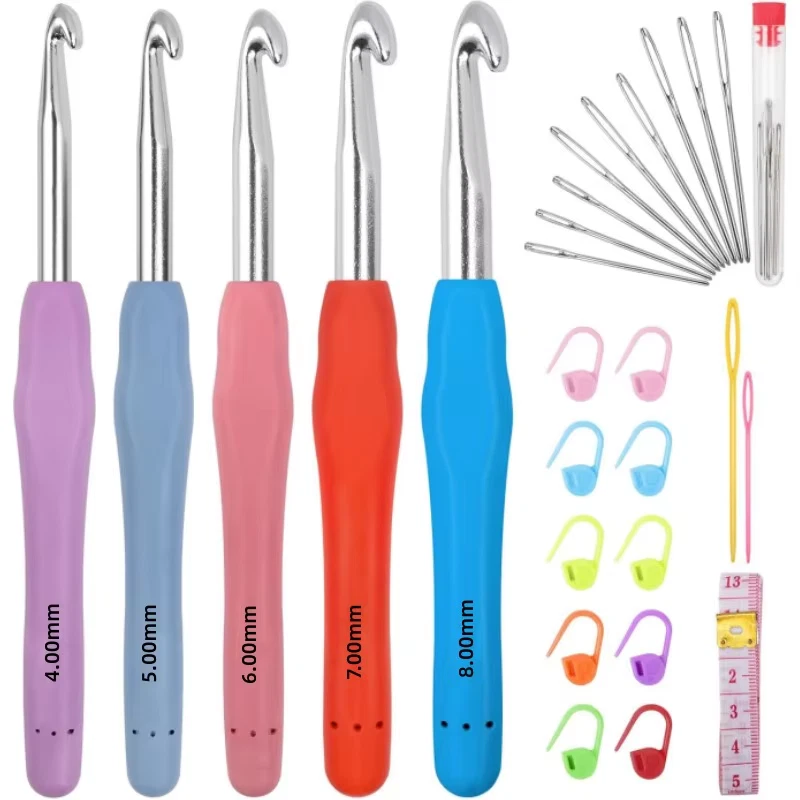 ✨ Ergonomic Crochet Hook Set – Perfect for Beginners & Arthritic Hands Whether you’re a beginner or an experienced crocheter, this complete crochet hook kit provides everything you need for smooth, comfortable, and efficient crocheting. With 12 sizes ranging from 2mm to 8mm , it covers all yarn types and project styles—from blankets and clothing to amigurumi and decorative crafts. 🌟 Key Features 🎨 Complete 12-Size Crochet Hook Set Includes hook sizes 2.0mm to 8.0mm , giving you the versatility to handle lightweight, medium, and bulky yarns. A perfect set for all your knitting and crochet projects. 💎 Premium Aluminum Hook Heads Made from high-quality aluminum , the hooks are durable, smooth, and resistant to bending. Each hook tip glides effortlessly through yarn without catching or snagging. 🧶 Ergonomic Soft Silicone Handles Designed with comfort in mind , the soft, non-slip grips help reduce hand fatigue—ideal for long projects or users with arthritic hands, joint pain, or weak grip strength . The hook is firmly embedded into the handle for extra durability. ✨ Smooth & Longer Hook Design The longer aluminum hook offers extra looping space , making it easier to work on complex patterns. Smooth edges ensure faster and more efficient crocheting. 🎒 Compact Storage Case Included Comes with a blue portable storage case to keep all hooks organized, clean, and easy to carry. Perfect for travel, craft classes, or everyday use. 📦 Package Includes Aluminum Crochet Hooks Sizes: 2.0mm–8.0mm 1 × Portable Storage Case Packing Content 51 pcs Crochet Hooks Set 12 Pieces Crochet Hooks: 2.0 mm crochet hook x 1pcs, 2.5 mm crochet hook x 1pcs 3 mm crochet hook x 1pcs, 3.5 mm crochet hook x 1pcs 4mm crochet hooks x 1pcs, 4.5 mm crochet hook x 1pcs 5 mm crochet hook x 1pcs, 5.5 mm crochet hook x 1pcs 6 mm crochet hook x 1pcs, 6.5 mm crochet hook x 1pcs 7 mm crochet hook x 1pcs, 8 mm crochet hook x 1pcs Tipps:The length of the crochet hooks is extended length: 15-15.5cm Other Accessories: Stitch markers for crocheting x 25 pcs Crochet rings for crocheting with cutter x 1 pcs Knitting needles set x 1 set (9 needles) Scissors x1 pcs Row counter x1 pcs Measuring tape x1 pcs Blue crochet hook case x 1 pcs 27 pcs Crochet Hooks Set 5 Pieces Crochet Hooks: 4 mm crochet hooks x 1pcs, 5 mm crochet hook x 1pcs, 6 mm crochet hook x 1pcs, 7 mm crochet hook x 1pcs, 8 mm crochet hook x 1pcs Tipps:The length of the crochet hooks is regular length: 14cm Other Accessories: Stitch markers for crocheting x 10 pcs Knitting needles set x 1 set (9 needles) Bent tip darning needles x 2 pcs Measuring tape x1 pcs 31 pcs Crochet Hooks Set 11 Pieces Crochet Hooks: 2.0 mm crochet hook x 1pcs, 2.5 mm crochet hook x 1pcs 3 mm crochet hook x 1pcs, 3.5 mm crochet hook x 1pcs 4mm crochet hooks x 1pcs, 4.5 mm crochet hook x 1pcs 5 mm crochet hook x 1pcs, 5.5 mm crochet hook x 1pcs 6 mm crochet hook x 1pcs, 7 mm crochet hook x 1pcs, 8 mm crochet hook x 1pcs Tipps:The length of the crochet hooks is regular length: 14cm Other Accessories: Stitch markers for crocheting x 10 pcs Bent tip darning needles x 6 pcs Row counter x1 pcs Measuring tape x1 pcs Blue crochet hook case x 1 pcs 12 Sizes Crochet Hook Set Enjoy the crocheting time For beginners and crochet lovers