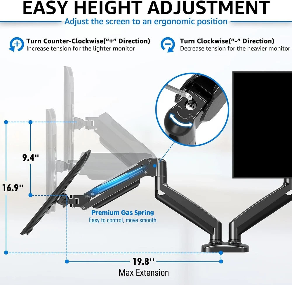 Ergonomic Dual Monitor Stand - Articulating Mount for 13-32 Inch Screens ‹ › ‹ › ‹ › ‹ › ‹ › ‹ › ‹ › ‹ › ‹ › Ergonomic Dual Monitor Stand -Articulating Mount for 13-32 Inch Screens -Universal Monitor Desk Mount Transform your workspace with the Ergonomic Dual Monitor Stand, designed to elevate your productivity and enhance your comfort levels. Whether working from home or in a professional setting, enjoy seamless viewing experiences with a setup that minimizes strain. Key Features: Compatible with screens weighing between 4.4lbs - 17.6lbs and measuring 13-32 inches diagonally. Supports VESA patterns 75x75 mm and 100x100 mm for universal adaptability. Full motion flexibility with 135° tilt, 180° swivel, and 360° rotation, allowing for perfect positioning. Effortless installation with C-clamp (0.39" - 4.53" thick desktops) or grommet base (0.39" - 3.15" thick desktops with a bolt-through hole). Premium gas spring arms enable 19.9" of arm extension and 9.4" height adjustment range for customized comfort. Cable management system keeps your work area tidy and free of clutter. Benefits: Reduces neck and back strain while working, allowing you to focus on your tasks. You can easily adjust each monitor independently to suit your style of work or collaboration. Freed desk space offers room for essential items or personal touches. Professional aesthetics complement any office décor. Durable design with extensive quality testing for reliable stability. Why Choose Our Ergonomic Dual Monitor Stand? Say goodbye to the discomfort associated with traditional setups! Our Ergonomic Dual Monitor Stand combines functionality and style, promoting a healthier work environment. With adjustable positioning and a sleek design, you can create a workspace that not only looks good but feels great, too. Elevate your productivity—order your Ergonomic Dual Monitor Stand today and experience the difference! Shipping Free & Fast Shipping - We offer free shipping to most of the USA with a normal delivery time of 3-7 days. However, due to the current situation, additional delivery time (up to 3 weeks) may be required for some items. Alternative Carriers - We may use alternative carriers (e.g. USPS, FedEx, UPS, etc.) to ensure your package arrives safely and on time. Due to the use of multiple carriers, we are unable to provide a tracking number automatically. Handling Time - Orders are processed and shipped within 1-2 business days of receiving cleared payment. Shipping Restrictions - Shipping to Alaska, Hawaii, Puerto Rico, Guam, and other US territories may incur shipping charges or delivery restrictions. Please contact us before ordering, or your order can be refunded/cancelled. State Restrictions - There may be restrictions based on your state of purchase. For example, certain items may not be shipped to California due to state regulations. Contact for Tracking Updates - If you require tracking updates or have any concerns about the delivery of your order, please feel free to contact us, and we will be happy to assist you. Return 30-Day Hassle-Free Returns - We want you to be completely satisfied with your purchase. If you are not, you can return the item within 30 days of receiving it for a full refund or exchange. Easy Return Process - To start a return, simply contact us and we will provide you with a prepaid return shipping label and detailed instructions. Restocking Fee - There are no restocking fees for returns. However, the buyer is responsible for return shipping costs if the return is not due to a seller's error. Refund Processing Time - Refunds will be processed within 5 business days of receiving the returned item in its original condition. Payment We accept all major credit cards, PayPal, and Apple Pay for your convenience. Your payment information is secure and encrypted to ensure a safe and seamless transaction. Please complete your payment within 3 days of purchase to avoid any delays in shipping. Feedback Your feedback is extremely important to us. We strive to provide the best products and customer service possible. If you are satisfied with your purchase, please take a moment to leave us a positive review. If you have any concerns or issues with your order, please contact us before leaving negative feedback. We are committed to resolving any problems and ensuring your satisfaction. Contact Us If you have any questions or concerns, please feel free to reach out to our customer support team. You can contact us through the eBay messaging system. We are available Monday to Friday, 9:00 am to 5:00 pm EST, and we will do our best to respond to your inquiry within 24 hours. Buy it now and enjoy a pleasant shopping experience! UPC: Not Set Unit Quantity: 8.47 Item Length: Not Set Item Width: Not Set Item Height: Not Set To Fit Screen Size: 32 in,13 in,14 in,15 in,16 in,17 in,18 in,19 in,20 in,21 in,22 in,23 in,24 in,25 in,26 in,27 in,28 in,29 in,30 in,31 in VESA Size: 100x100 mm,75x75 mm Features: Adjustable Gas Spring,Cable Management,Full Motion,Tilt,Swivel,Rotate Compatible Product Line: Universal Brand: Unbranded Type: Desk Mount Number of Monitors: 2 Color: Black Adjustment: Tilt & Rotate MPN: Not Set Unit Type: lb Country/Region of Manufacture: Not Set Manufacturer Warranty: Not Set