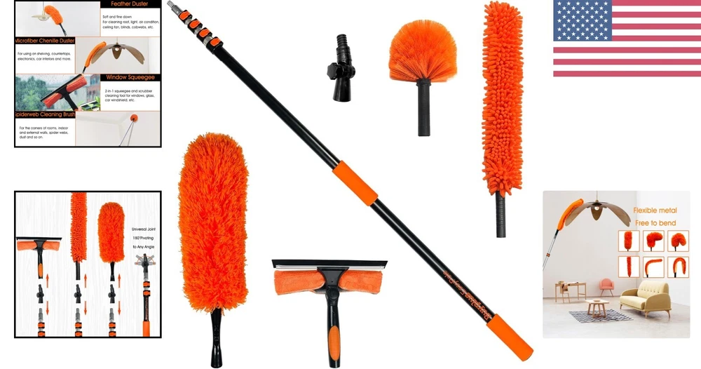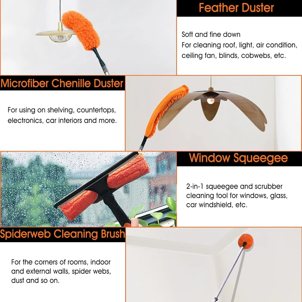 For: Indoor Volume: 58 x 4 x 3.5 inches Capacity: 1 Item Length: Duster Cleaning Kit Special Feature: Bendable, Ergonomic_handle UPC: Does not apply Handle Material: Microfiber Type: Duster Cleaning Kit Item Weight: 5.79 pounds Head Material: Microfiber Color: Orange-20ft Form: Tool Number in Pack: 1 Item Height: Duster Cleaning Kit Brand: Unbranded Package Dimensions: 58 X 4 X 3.5 Inches Personalize: No Recommended Uses For Product: Fan, Window, Wall, Picture Frame, Blind Item Firmness Description: Soft Item Width: Duster Cleaning Kit Scent: Scent Free gtin13: Does not apply Features: Telescopic Handle, Extension Pole, Universal Joint, Window Squeegee, Microfiber Duster, Bendable, Ergonomic Handle, Soft Rubber Grip Product Care Instructions: Hand Wash Only