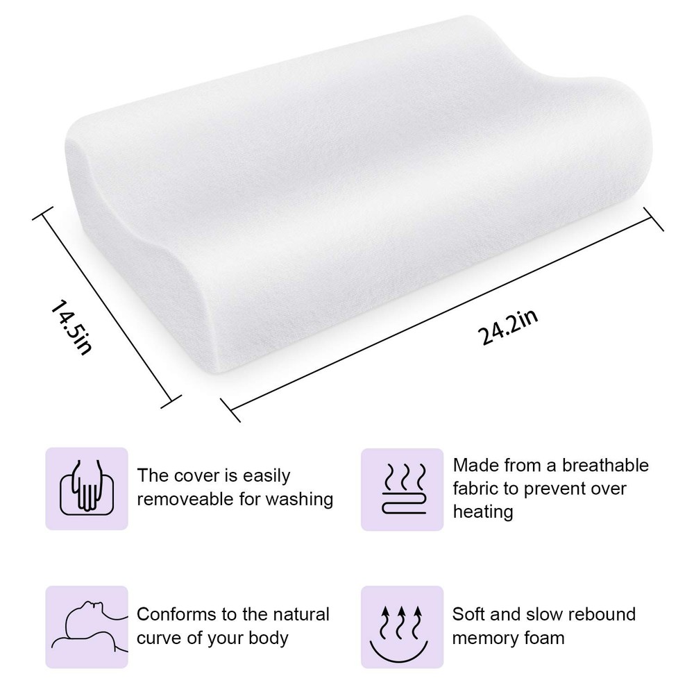 đăPRESSURE RELIEFă: Ergonomics design, conforms to the natural curve of your body and supports your head and neck. Reduces neck & back pain, alleviates shoulder stiffness, promotes proper spine alignment, and helps your muscles relax. Best pressure relief for you. đăRELIEF SLEEPă: Suit all kinds of sleepers(side, back, stomach). Soft and slow rebound memory foam contour pillow relieve snoring and orthopedic pain and ensure to give you the superior comfort. ZG-Home cervical support pillow is ideal for the elderly, office workers, students, snorers, and those with sleep disorder. đăMEMORY FOAMă: Make from upgrade memory foam and ensure the pillow can remain consistent firmness and comfortable soft all year. ZG-Home cervical bring you a safe and heathy sleeping night. đăDESIGN FOR COMFOUR FEELINGă: The memory foam pillow is queen size 24ââĂ15ââ. Designed with 2 sides, one higher (5") and one lower (4. 5") , which allows it to be perfect for all kinds of sleepers (side / back / stomach). Here is always one side that suits your sleep habits đăVELVET PILLOW COVERă: Soft velvet made memory foam pillow cover, it is full removable and machine washable. More convenient for your healthy and easy life. đăSATISFACTIONă30-night 100% satisfaction. If you are unsatisfied, simply contact us to return the product for a full refund. NOTE: This pillow is rolled up in a NON-SEALED plastic bag to maintain its rebound ability. Generally, takes 1-2 hours after unpacking to retain form.