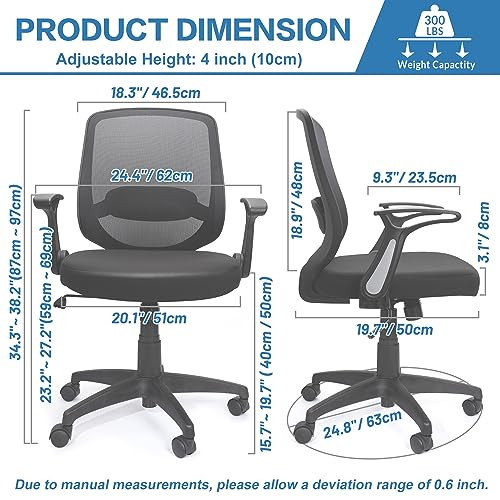 Return Policy Fast Delivery Trusted seller Mid Back Mesh Office Chair Ergonomic Swivel Black Desk Office Chair Flip Up Armrests with Lumbar Support Adjustable Height Computer Task Chairs Product Description 100% Nylon MULTIFUNCTIONAL MESH OFFICE CHAIR: 360° swivel, height adjustable, flip up armrest, adjustable lumbar support, rocking mechanism with tilt tension adjustment knob, high quality gas lift cylinder, durable nylon base and flexible 360°swivel casters ERGONOMIC OFFICE CHAIR: This office chair designed with adjustable padded lumbar support (adjustable range: 1.97 in), providing good back support to reduce back pain. The lumbar support padded with a sponge to provide all-day comfort FLIP UP ARMRESTS: Fold up the armrests when not in use and slides this office chair under the desk for space-saving. The armrests can be removed easily, changing the chair into an armless chair in seconds whenever you want BREATHABLE MESH OFFICE CHAIR: The thick seat, padded with good quality sponge and covered by American-made mesh, is comfortable, breathable, resilient and not easy to deform. High density mesh back offers firm back support and good breathability EASY TO ASSEMBLE: Our office chair comes with all parts and necessary tools you need. you can finish assembling within 20 minutes by following the instruction. We also provide the video instruction to help you Shipping Returns Payment Shipping Shipping is FREE to all addresses other than APO/PO boxes in the lower 48 states. All our stock ships from US-based warehouses. Shipped via USPS or UPS (depending on location and package weight) Unless stated otherwise, all orders will ship within 24-72 hours of your payment being processed. Check our feedback to see the great reviews of FAST shipping we offer. Returns Seller does not accept returns Payment We currently accept payment via eBay managed payments only. Once payment is cleared, we will dispatch your shipment within 1-3 business days. Please refer to the "Shipping" tab for more information regarding shipping speed to your destination.