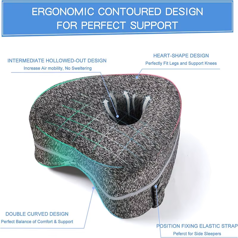 Ergonomic CURVED DESIGN -- The ergonomic design of Leg Pillow perfectly fits the curve of the human body, keeps your legs in a natural position during sleep. Unlike traditional knee pillows, the knee pillow features a true ergonomic design with its soft curves & heart shape to fit men & women comfortably and can fit the legs and knees at the same time. Brings you a healthy and deep sleep that lasts all night! π ELASTIC BAND DESIGN: Our knee cushion is equipped with an elastic strap so that it will not slip when you adjust your sleeping position, no need to fumble when the light is off, and ensure a comfortable sleeping all night long. π PREMIUM MEMORY FOAM & REMOVABLE & WASHABLE COVER -- knee pillows are made of premium memory foam. The pillow cover is made of high-quality breathable and soft cationic fabric which does not shrink or pilling, and it will keep the memory foam dry and hygienic for a long time. Please take out the memory foam through the zipper and wash the pillow cover by hand or machine. NOTE: The Memory Foam Pillow Core CANNOT be washed. π SLEEP BETTER FOR ANYONE -- sleeping knee cushion is a good companion for people who lack sleep. Anyone suffering from sleeping discomfort can benefit from knee wedge pillows. You can place it wherever you need, such as thighs, calves, knees, or even neck. The leg bolster really helps a lot and is warmly welcomed by pregnant women and side sleepers. π WIDE APPLICATIONS -- The leg cushion for sleeping can not only be used at bed, sofa, office, recliner, airplane or long-distance travel but also a good present to show your care to somebody you love. This good-looking pillow is widely used when people are sleeping, reading or watching TV.