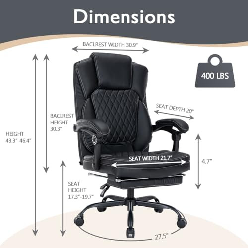 Menu 1. We require immediate payment. 2. We currently accept payment via eBay managed payments only. 3. Once payment is cleared, we will dispatch your shipment within 1-3 business days. Please refer to the "Shipping" tab for more information regarding shipping speed to your destination. Ergonomic Office Chair with Footrest, Executive Chair PU Leather Computer Chair, Reclining Desk Chair with Leg Rest, Coil Spring Thick Cushion, Big and Tall Chair 400 lbs Capacity | Black Product description 【SPECIALLY BIG SIZE】 As a big person, you may struggle to find a large durable executive chair for yourself. Now office chair is a great choice to solve your issue. Larger Back:30.9”w * 30.3”h Wide Breathable Seat Cushion: 21.7”w * 20”d This Big and Tall Office Chair Seat Height from Floor: 17.3”- 19.7” 【RECLINING MADE ALL-DAY COMFORT】Looking for a comfortable office chair to keep you supported while working? Our executive office chair comes with a 90-155° back adjustment and a retractable footrest feature, plus a lock handle that allows you to sit back when you feel exhausted. Lie down during a busy workday to rest or take a quick nap to recharge and continue your work afterward 【FOCUS ON COMFORT】Reclining office chair features a spring padded back and foam seat, ergonomic back support, linkage padded armrest, upgrade your workspace with a high-performing desk chair. This elegant reclining office chair to reduce your body pain and help you relax while tackling the day's to-do list 【PREMIUM MATERIALS】Our executive office chair is made with premium faux leather that is waterproof and stain-resistant, easy to wipe clean. The PU leather executive chair unique looks make it perfect addition to any office. Get that just-right feel with our practical sitting support , featuring a stable board, foam, spring pack and super soft sponge in the seat cushion for optimum support 【400LBS+ HEAVY DUTY OFFICE CHAIR】This managerial chair is specially designed for big and tall groups and looks much bigger than normal chairs. Adopting reinforced and upgraded chair base, our oversized office chair has an outstanding weight capacity exceeding 400lbs. More sturdy, durable and the user's safety, these executive chairs are bound to serve everyone's needs 【EASY TO INSTALL】 The home office chair is equipped with all parts and necessary installation tools. Follow the instructions provided and you will find that it is easy to assemble, and the estimated assembly time for the office chair is about 20 minutes. In addition, we provide an installation video on the page 【1 YEAR WARRANTY WORRY-FREE PURCHASE WITH YOUR OFFICE CHAIR】 Customer satisfaction about our office chair is our top priority! We are certain that you will love our big & tall chair but if for any reason you are not completely satisfied, please feel free to contact our customer service. They will respond promptly. So, if anything goes wrong, just let us know, If your chair parts broken, we can reship the parts for you, or replace the chair PLEASE MESSAGE US IF YOU HAVE ANY OTHER QUESTIONS, AND MANY THANKS FOR READING ALL OF THIS. Copyright ©#. All Rights Reserved.