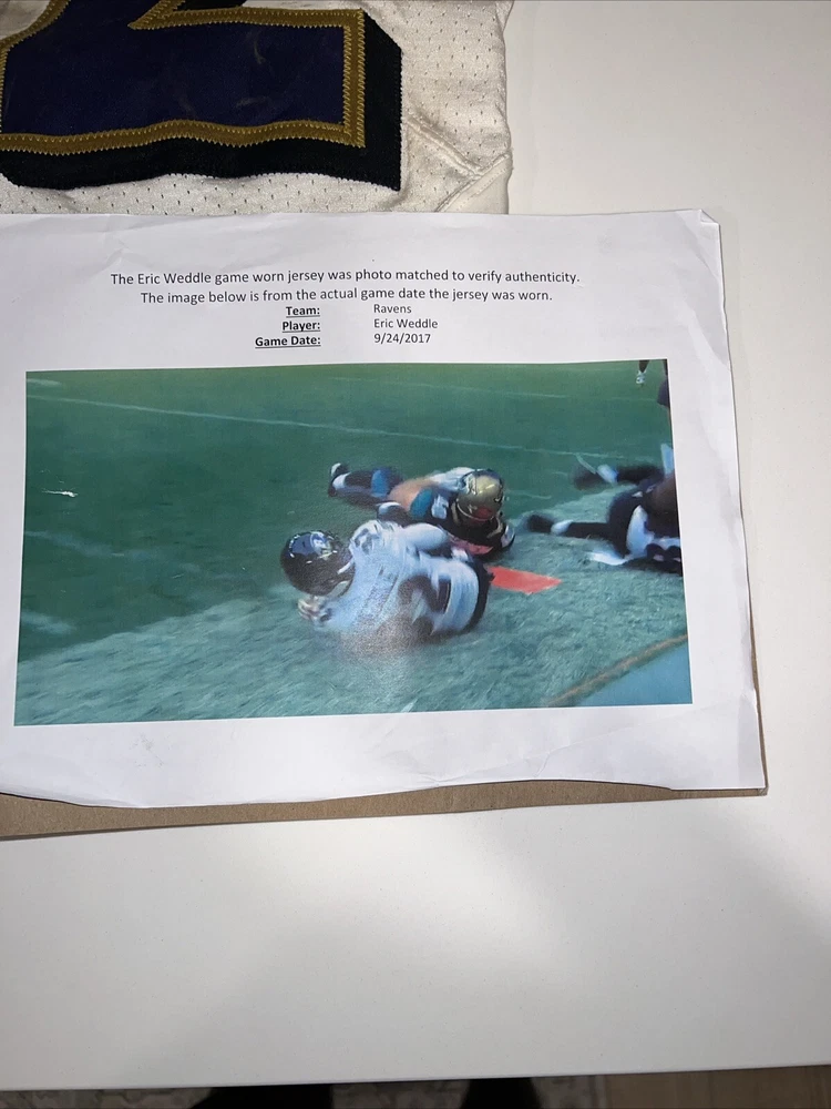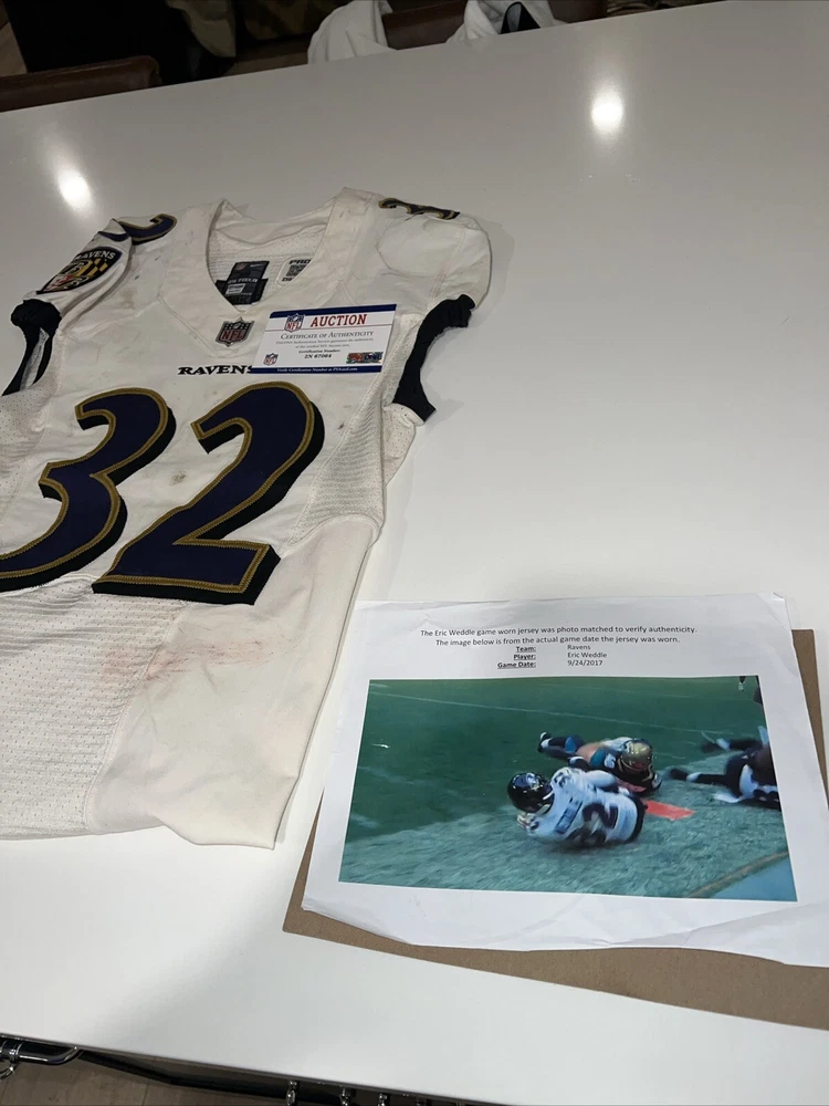 This Eric Weddle game-worn Ravens jersey is a must-have for any football fan. The jersey was actually worn by Weddle during a game on September 24, 2017, making it a highly sought-after item for collectors. The photo match ensures that the jersey is authentic and adds to its overall value. The jersey is made in Weddle's home country of Canada and features the Ravens logo on the front. It is perfect for fans of the National Football League (NFL) and is a great addition to any collection of game-used memorabilia. Don't miss out on the chance to own this unique piece of football history.