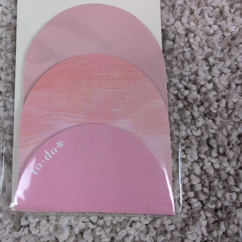 Erin Condren warm pastel sticky notepad shapes 3 pack adhesive sheets. This set includes three distinct pads, each containing 25 sheets for a total of 75 adhesive sheets. The pads feature unique semi-circular shapes in coordinating pastel hues. One pad is a solid soft pink with a subtle 'to-do' graphic. The middle pad displays a textured watercolor-inspired design in shades of pink and coral. The largest pad is a soft lavender pink. These sticky notes are perfect for adding a touch of color and organization to planners notebooks and various paper crafts. From Smoke Free/Cat Friendly Home Keywords: Erin Condren, sticky notes, notepad, planner accessories, stationery, pastel colors, organization, scrapbooking, craft supplies, adhesive notes, to do list, paper crafts