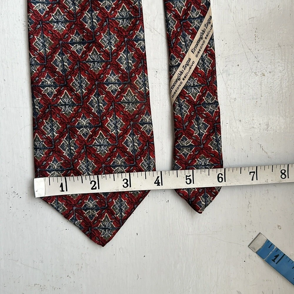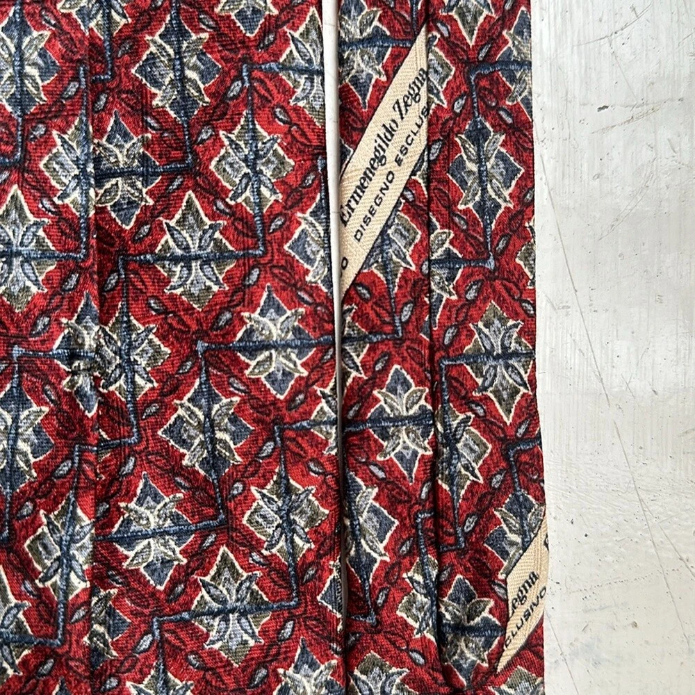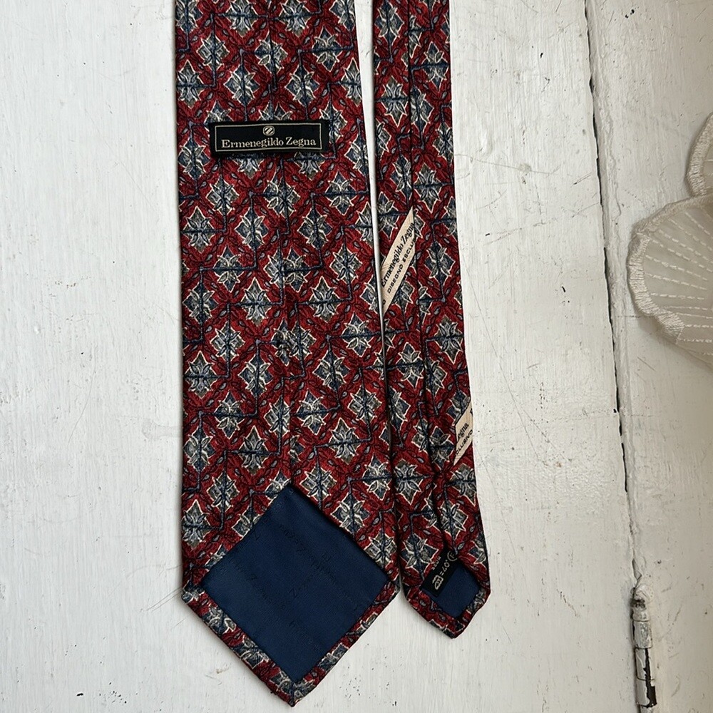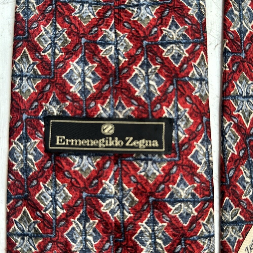 Ermenegildo Zegna 100% silk jacquard tie Geometric pattern Red /blue colorway Signature lining Tie's fabric with jacquard woven signature imprint Total length 58.5" Made in Italy Very good preowned condition