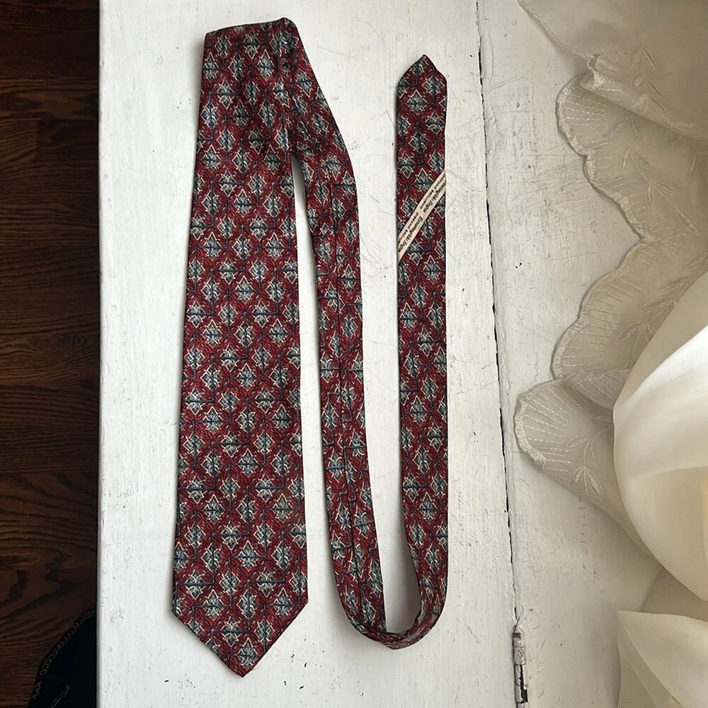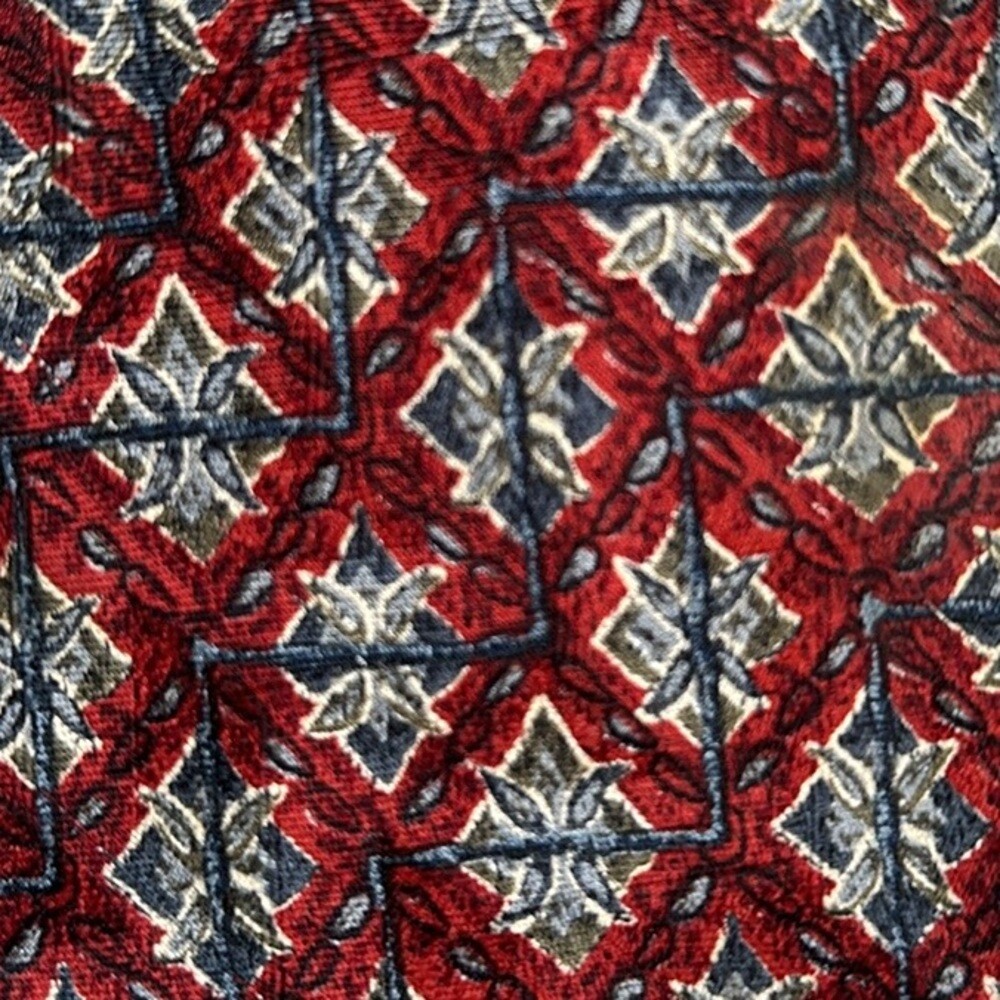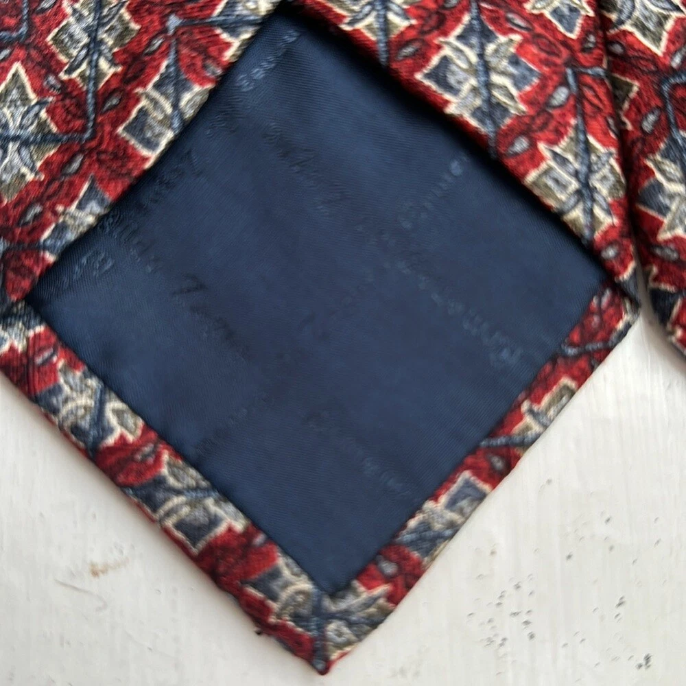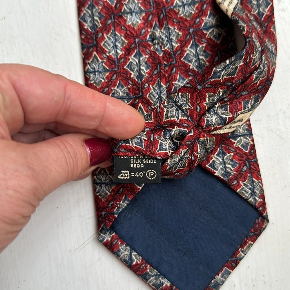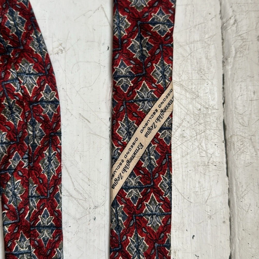 Ermenegildo Zegna 100% silk jacquard tie Geometric pattern Red /blue colorway Signature lining Tie's fabric with jacquard woven signature imprint Total length 58.5" Made in Italy Very good preowned condition