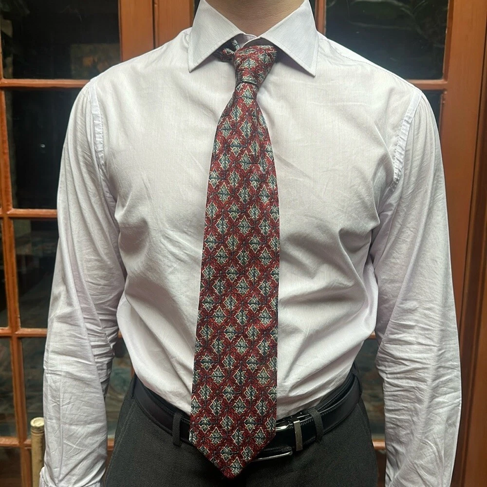 This Ermenegildo Zegna silk tie is absolutely stunning! The rich red and blue geometric jacquard pattern has a luxurious texture, and the craftsmanship is impeccable—just what you’d expect from Italian-made Zegna. The signature lining and woven imprint add a sophisticated touch. At 58.5", it’s the perfect length for a polished look. Even as preowned, it’s in fantastic condition—like new! A must-have for any stylish wardrobe.