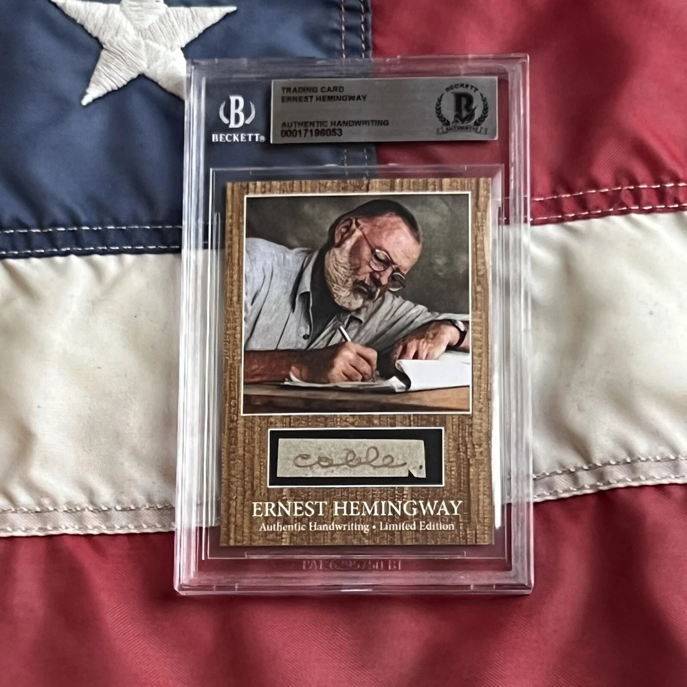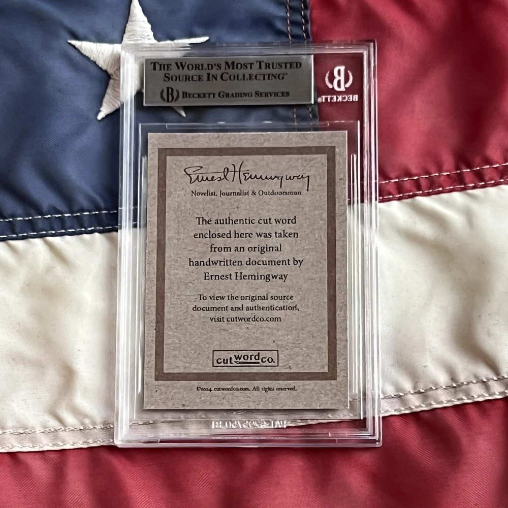 Offered for the first time ever – genuine handwritten words from renowned American novelist, short story writer and journalist, Ernest Hemingway, authenticated and encapsulated by Beckett. You will not receive a copy of the letter from Hemingway, the 4th image is shown purely to illustrate where the words came from. You will only receive the BAS encapsulated word, encapsulate #00017196053. An exclusive CutWordCo Limited Edition, this is the first set of Hemingway words encapsulated by Beckett we’ve ever offered for sale! Each individual word was carefully removed from an original handwritten letter from Hemingway. Own penmanship from the same hand that wrote classics such as “The Old Man and the Sea”, and “For Whom the Bell Tolls”, and “A Farewell to Arms”. Each encapsulated word was individually removed from a January 1958 letter from Hemingway on his beloved Finca Vigia letterhead. Writing from his home overlooking downtown Havana, Hemingway found himself unable to reach a deal on his novel, “Across the River and into the Trees”, despite the persistence of his correspondent. Genuine Hemingway documents can often fetch thousands of dollars. The cost of authenticating a single word of Hemingway’s handwriting is $100 on Beckett's website.