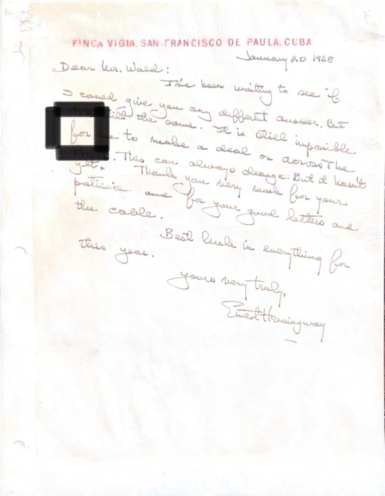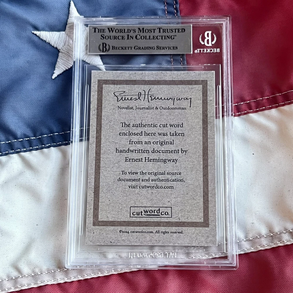 Offered for the first time ever – genuine handwritten words from renowned American novelist, short story writer and journalist, Ernest Hemingway, authenticated and encapsulated by Beckett. You will not receive a copy of the letter from Hemingway, the 4th image is shown purely to illustrate where the words came from. You will only receive the BAS encapsulated word, encapsulate #00017195998. An exclusive CutWordCo Limited Edition, this is the first set of Hemingway words encapsulated by Beckett we’ve ever offered for sale! Each individual word was carefully removed from an original handwritten letter from Hemingway. Own penmanship from the same hand that wrote classics such as “The Old Man and the Sea”, and “For Whom the Bell Tolls”, and “A Farewell to Arms”. Each encapsulated word was individually removed from a January 1958 letter from Hemingway on his beloved Finca Vigia letterhead. Writing from his home overlooking downtown Havana, Hemingway found himself unable to reach a deal on his novel, “Across the River and into the Trees”, despite the persistence of his correspondent. Genuine Hemingway documents can often fetch thousands of dollars. The cost of authenticating a single word of Hemingway’s handwriting is $100 on Beckett's website.