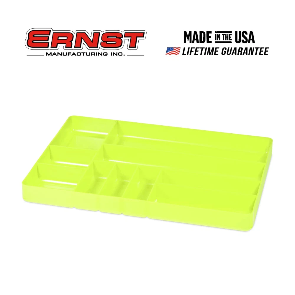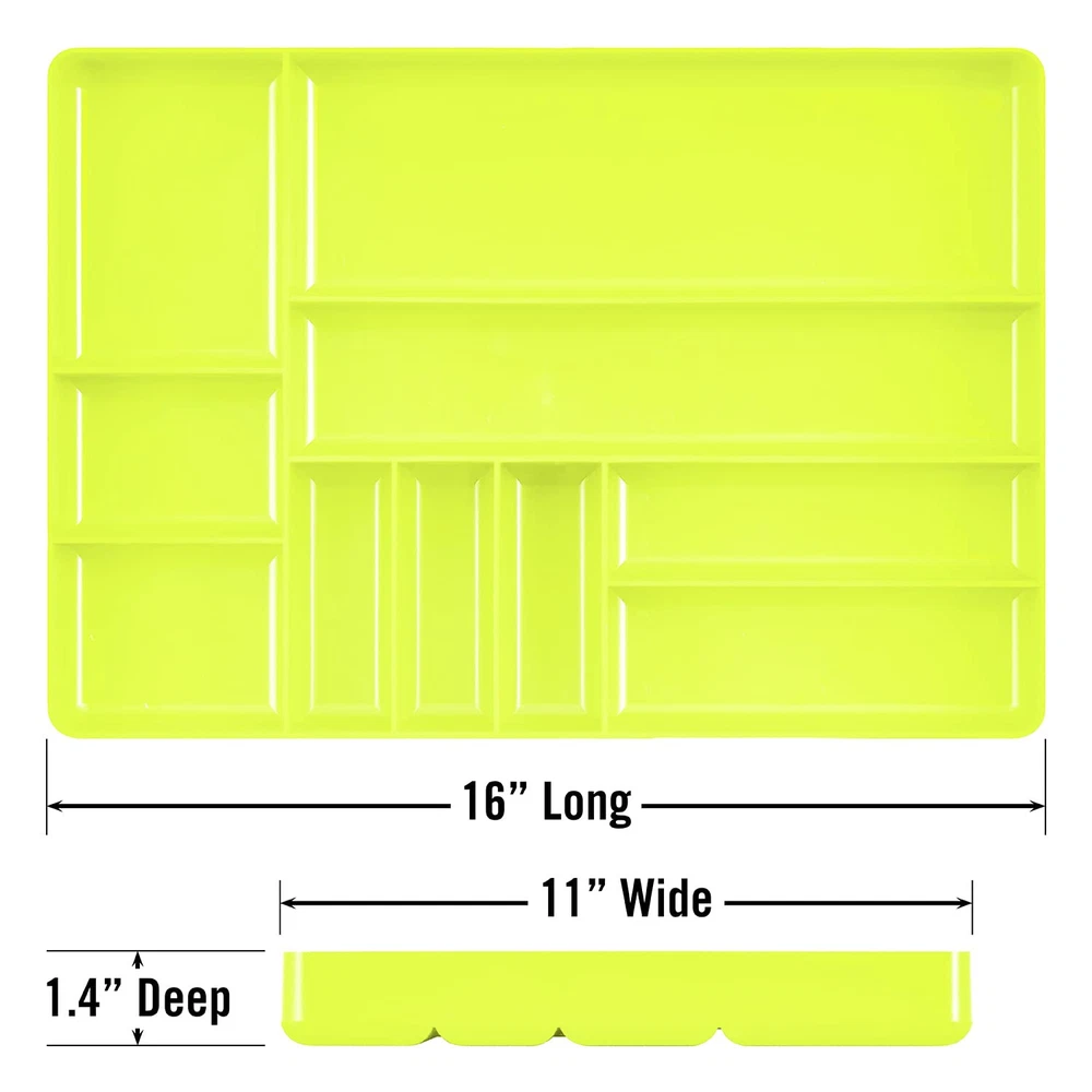 Value-priced, high quality tools - leading the market by ensuring that products are rugged, reliable and reasonably priced. Versatile Compartmentalization: This toolbox drawer organizer offers 10 flexible compartments, perfect for arranging an array of tools and parts, including nails, bolts, wrenches, screwdrivers, and more. Wide Compatibility: Featuring a low-profile design, this toolbox accessory effortlessly fits into shallow toolbox drawers, ensuring a seamless and intuitive organization experience. Efficient Stackable Storage: Designed for convenience, this tool chest drawer organizer is stackable, allowing for the storage of multiple shallow tool organizers on top of each other, facilitating easy access to parts. Improved Accessibility: The tool tray organizer boasts rolled edges at the bottom, enabling easy retrieval of small bits and fasteners. This feature ensures a smooth transition between tools, enhancing efficiency and speeding up job completion. Durable Construction: Crafted from high-impact plastic, this tool chest organizer is built to endure. Whether stored or transported, it maintains its structural integrity in various environmental conditions.