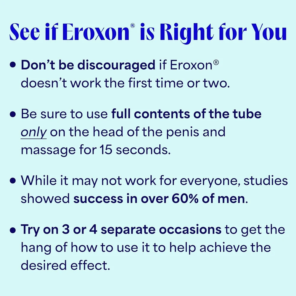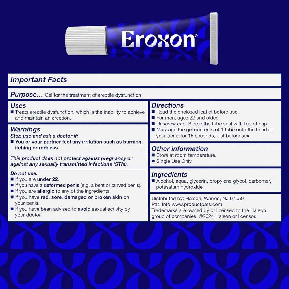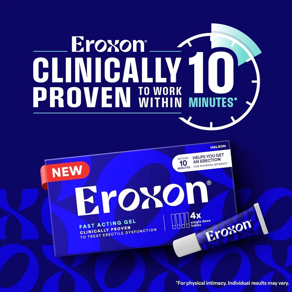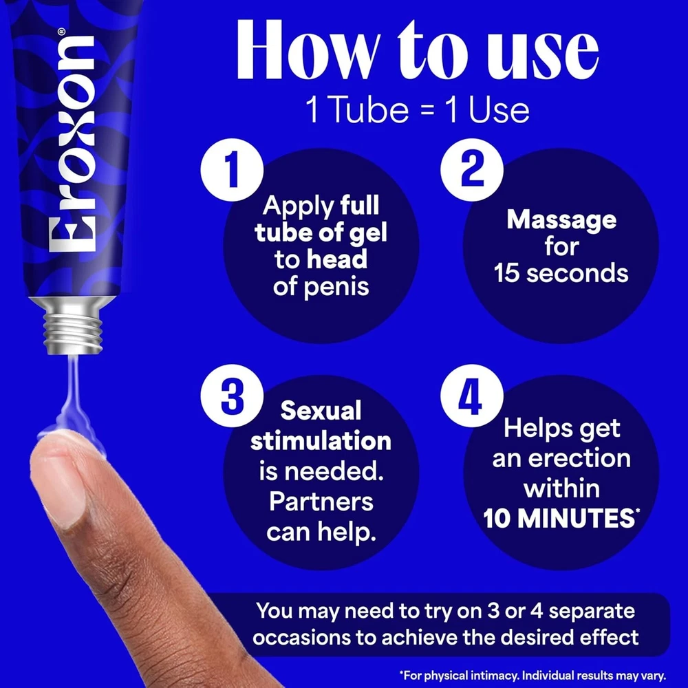 4 Single Use Tubes of Eroxon Erectile Dysfunction Treatment Gel, Clinically Proven Topical Treatment for Adult Men Fast-Acting: Clinically proven to work within 10 minutes*; While it may not work for everyone, studies showed success in over 60% of men FDA-cleared: The first and only FDA-cleared ED treatment available without prescription made in the US Safety: Safe for you and your partner; Eroxon ED treatment gel is a direct application that helps you get and maintain an erection without going through your bloodstream How To Use: Apply full tube of gel on the head of the penis and massage for 15 seconds; for best results, use Eroxon when sexually stimulated and with a partner as part of foreplay Keep at it: Don’t be discouraged if Eroxon doesn’t work the first time or two; Try on 3 or 4 separate occasions, as it may take a few uses before achieving the desired effect Spontaneity: Works within 10 minutes* helping to reclaim those intimate moments, unlike prescription ED pills that can take up to 60 minutes to work Designed for ED: Eroxon is not a sexual lubricant and has not been tested in that way