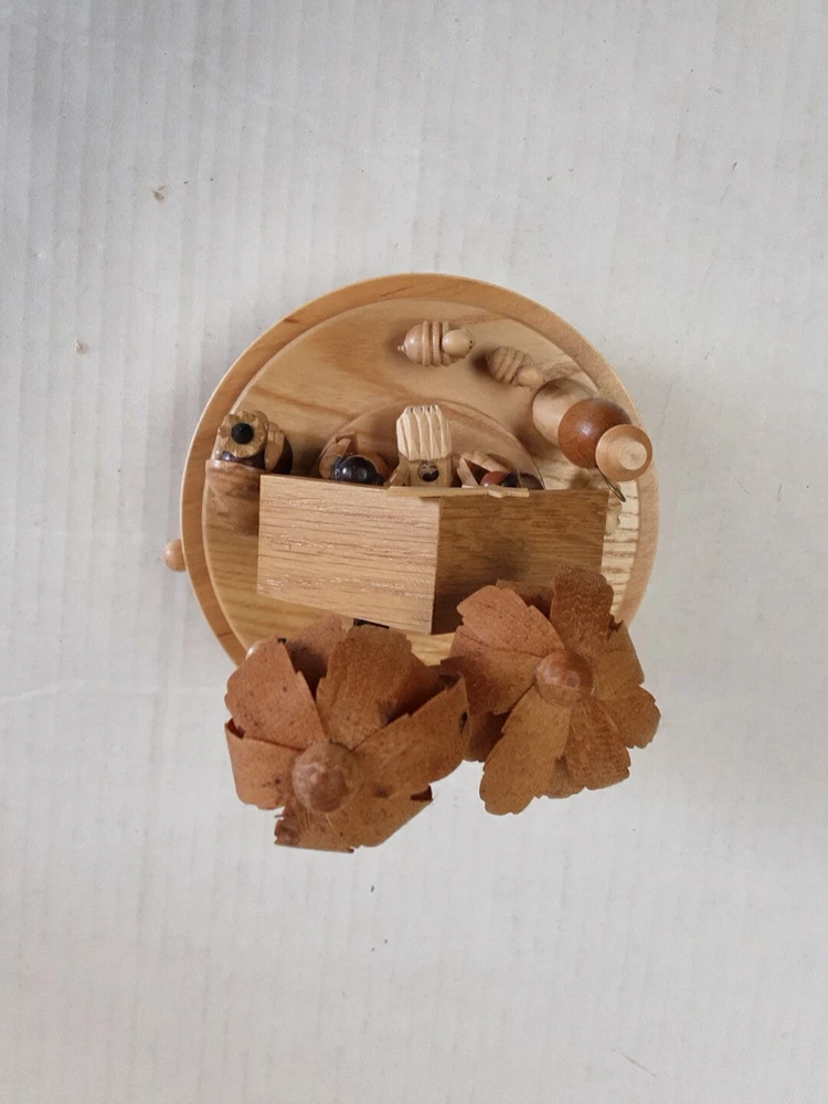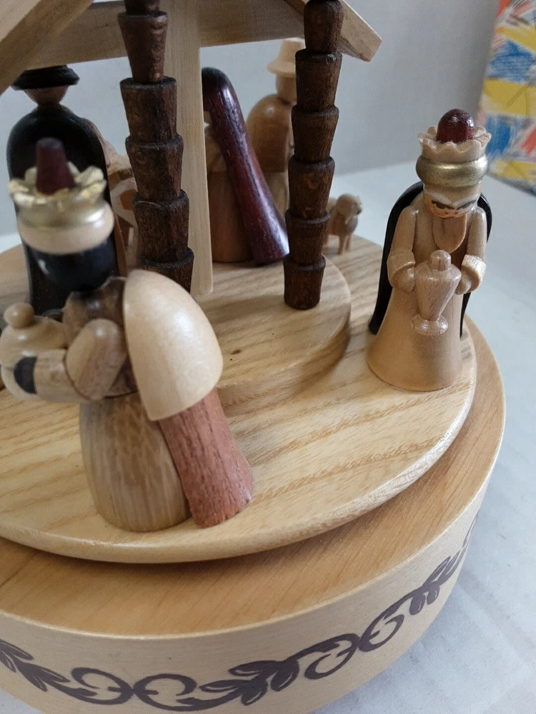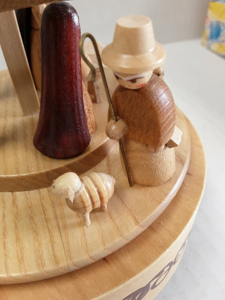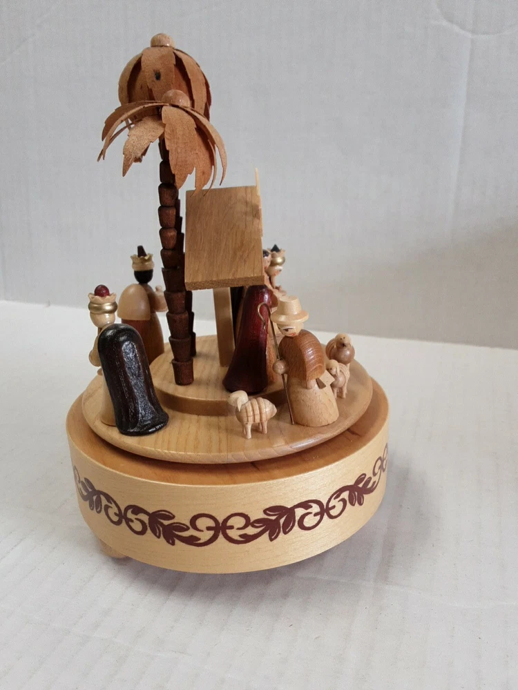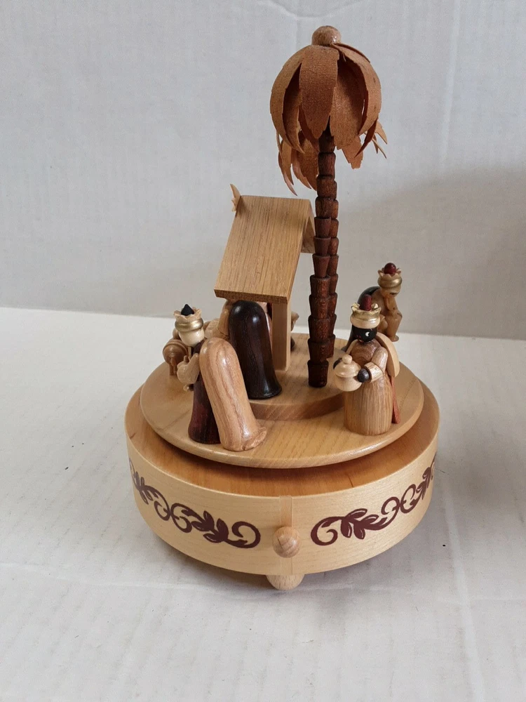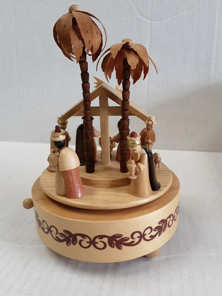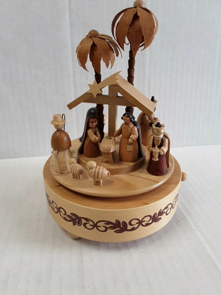 Theme: Christmas Nativity Scene Song Music Box Plays: Silent Night, Holy Night Holiday: Christmas Origin: East Germany Manufacturing Type: Hand Carved Material: Wooden