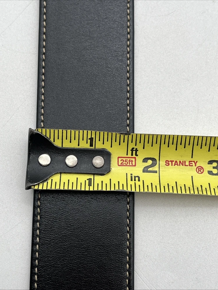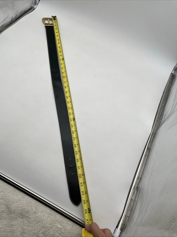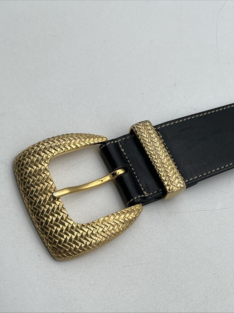 Vintage Escada women’s belt, made in Italy. • Brand: Escada • Color: Black with gold-tone hardware • Material: Genuine leather • Buckle: Gold-tone woven textured design • Size stamped: 38 (fits approx. EU 90 / US Medium) • Length (including buckle): 35 in (89 cm) • Fits waist approx. 28–30 in (71–76 cm) • Made in Italy 📌 Condition: Pre-owned, very good condition. Light signs of wear on leather and buckle (see photos). This luxury Escada belt with a bold gold buckle is perfect for both casual chic and elegant outfits.